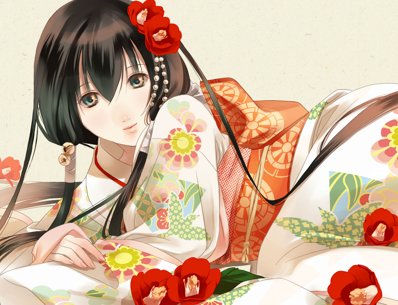 Description: A woman in a kimono laying on a bed with flowers in her hair and a flower in her hair.