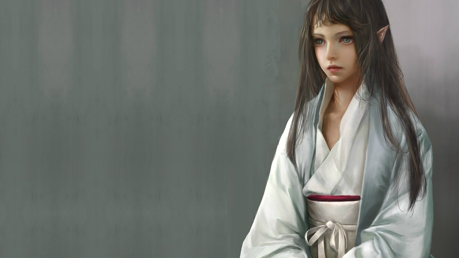 Description: A painting of a woman in a kimono holding a cup of coffee and looking at the camera with a serious look on her face.