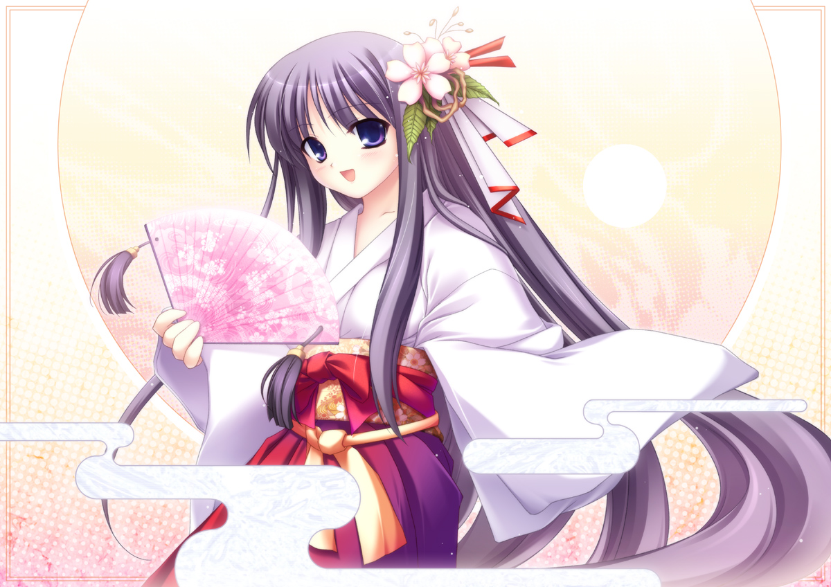 Description: A woman in a kimono holding a fan and a pink flower in her hair and a pink flower in her hair.