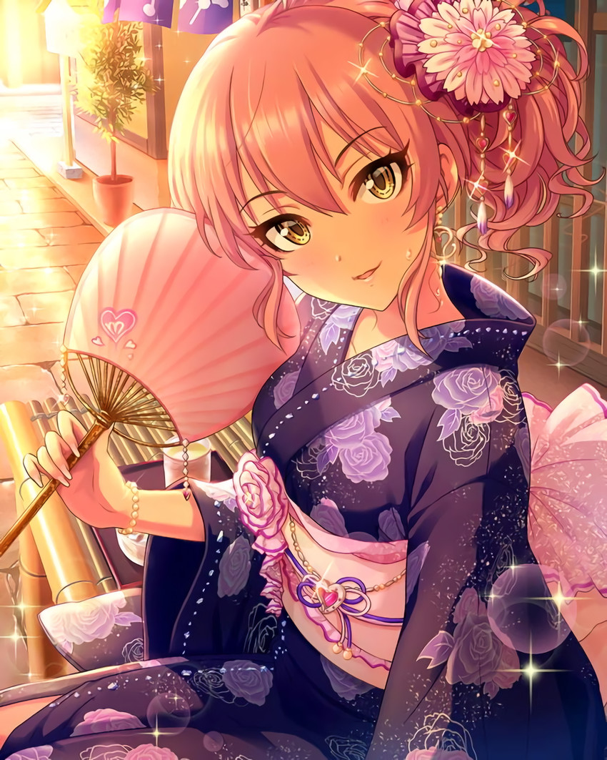 Description: A woman in a kimono holding a fan and a flower in her hand.