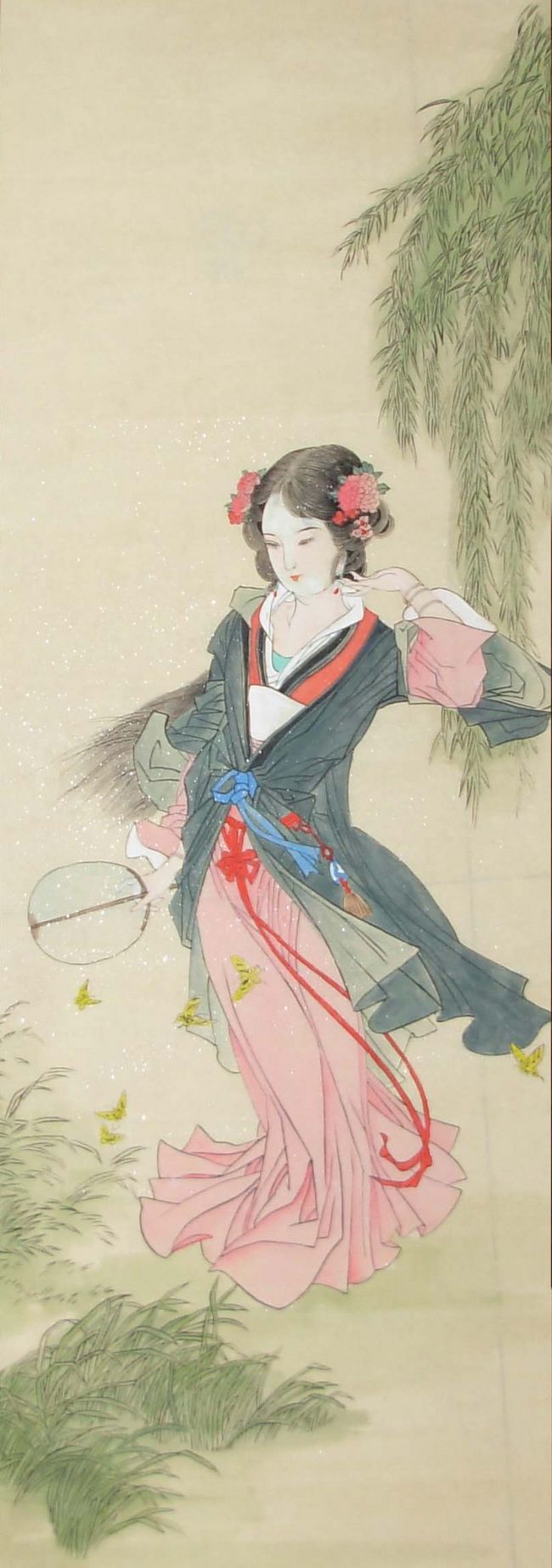 Description: A painting of a woman in a kimono holding a fan and a man in a suit and tie.