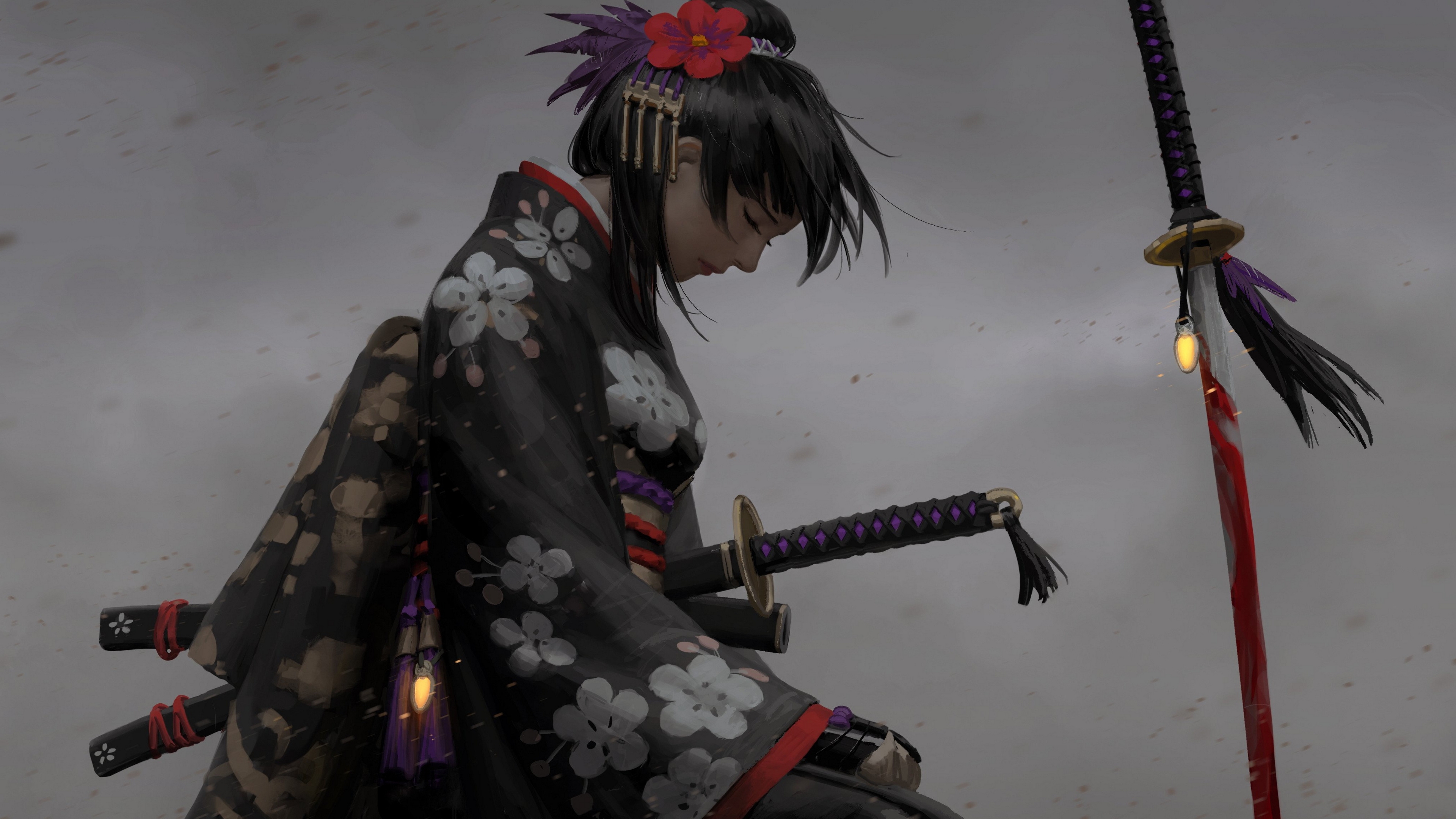 Description: A woman in a kimono holding two swords and a sword in her hand.