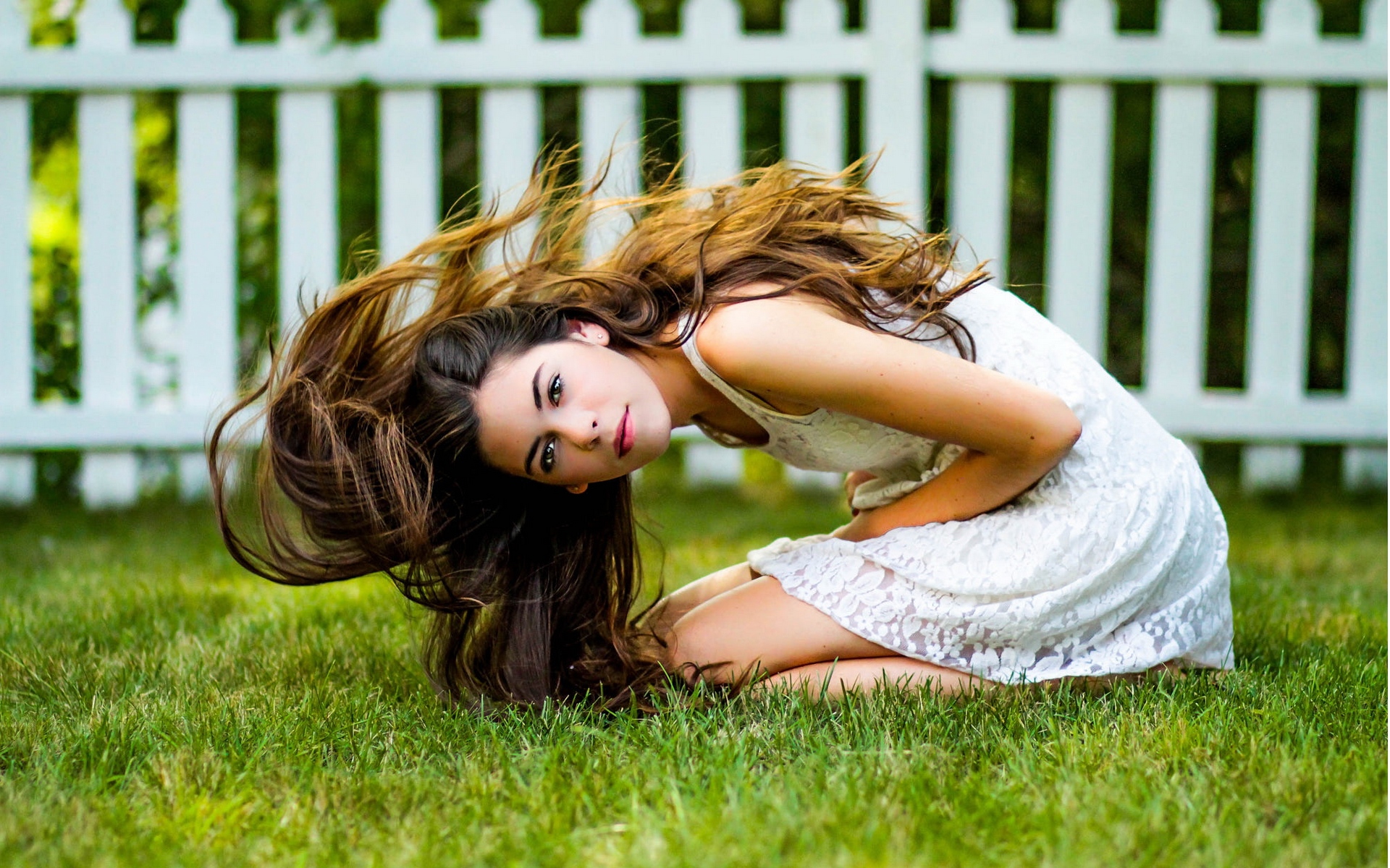 Description: A woman is kneeling down in the grass with her hair blowing in the wind and a white fence behind her.