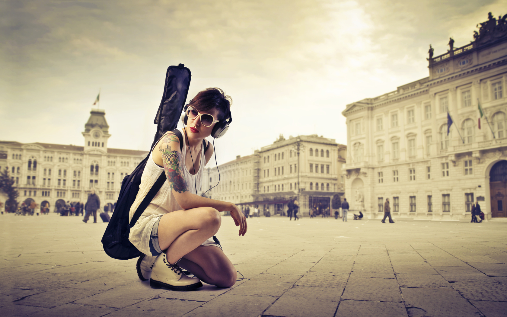 Description: A woman kneeling down with a guitar case on her back and a backpack on her shoulder.