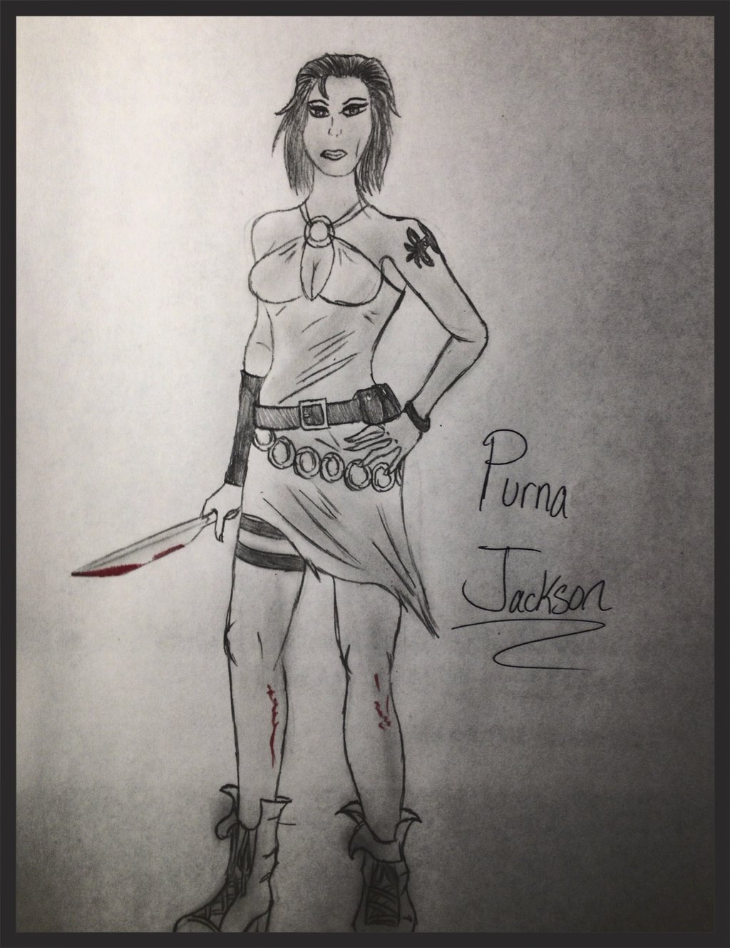 Description: A drawing of a woman with a knife in her hand and a name on the picture below it that says puma.