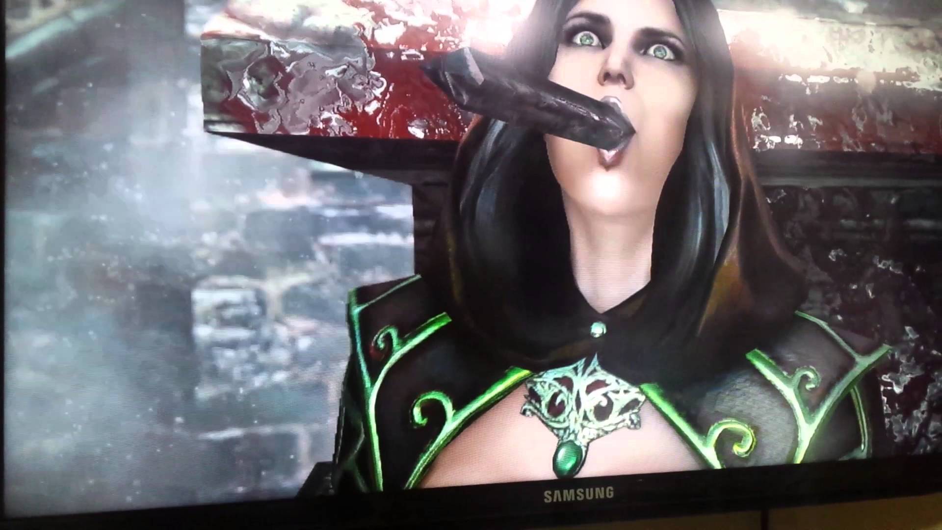 Description: A woman with a knife in her mouth on a television screen with a bloody background and a bloody cross.