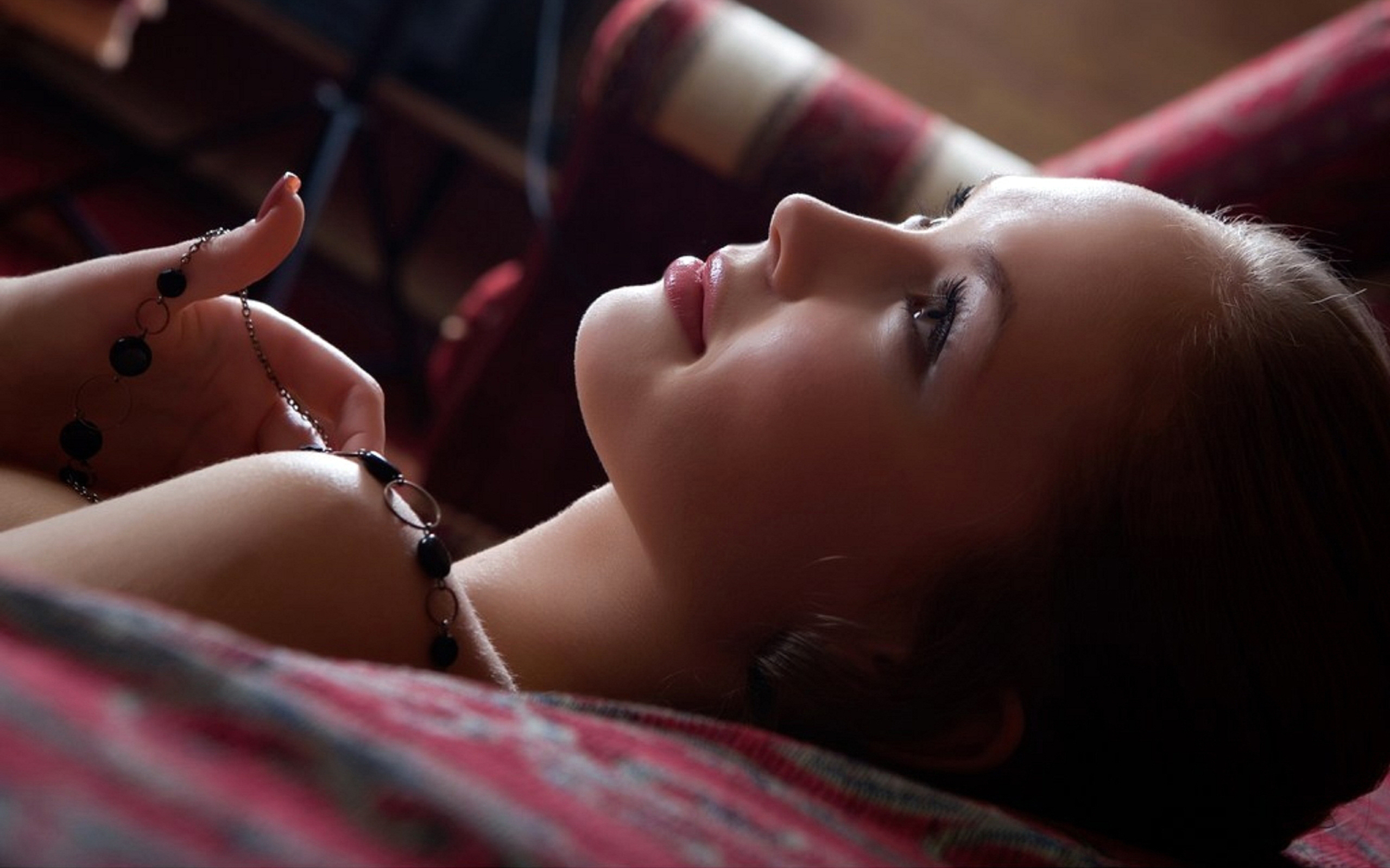 Description: A woman laying on a bed with her eyes closed and her hand on her chest and a ring on her finger.