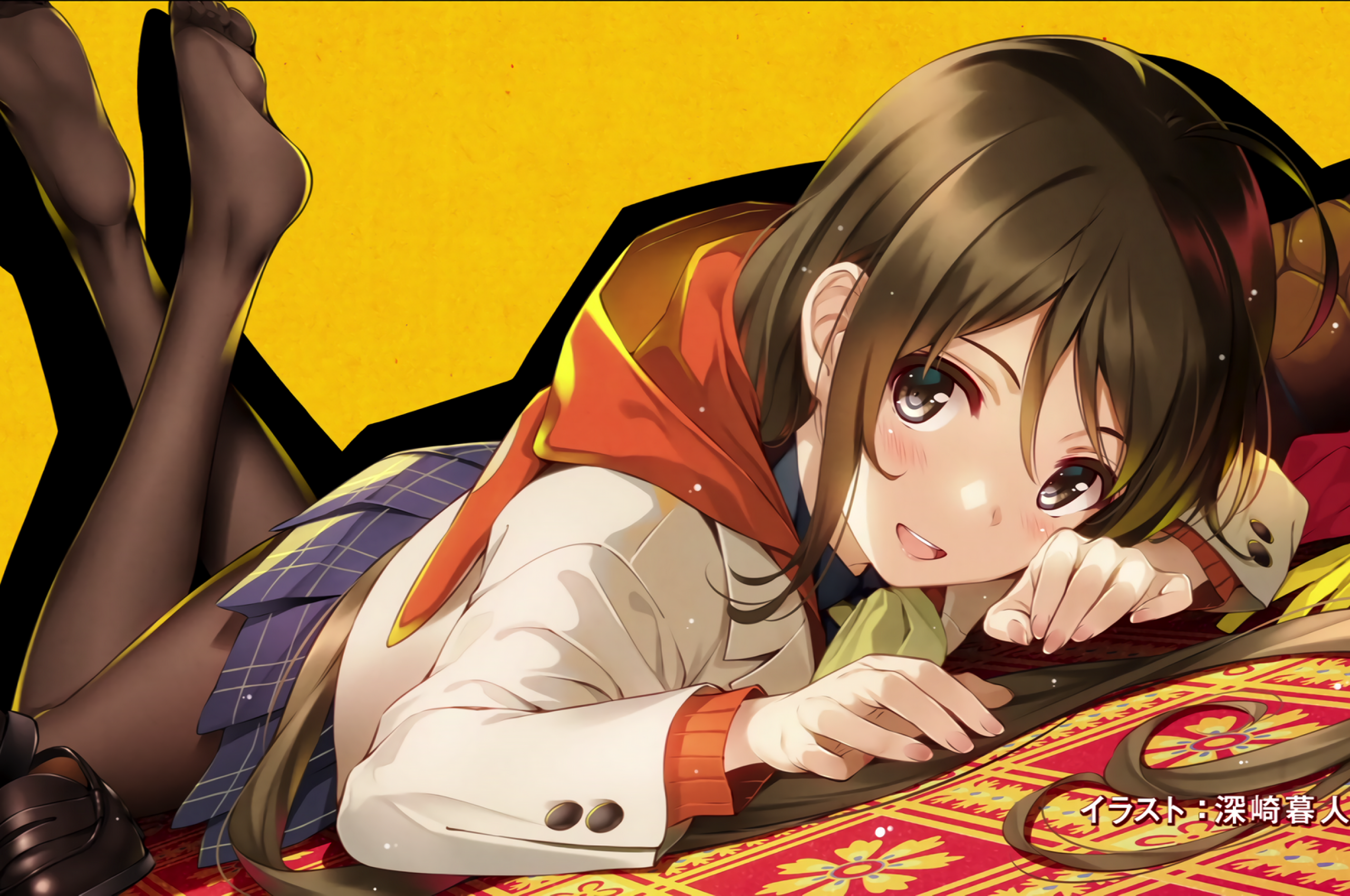 Description: A woman laying on a bed with a pair of scissors in her hand and a yellow background behind her.