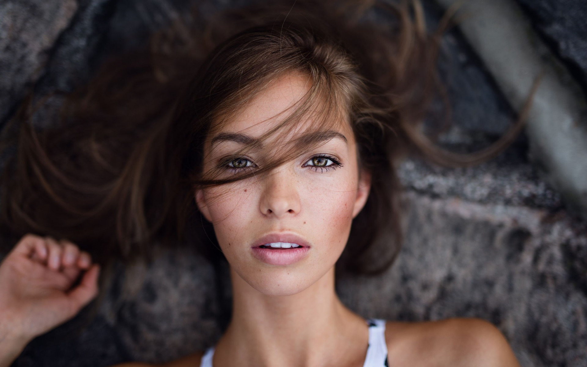 Description: A woman with long hair laying on a rock with her eyes closed and her hair flying in the air.