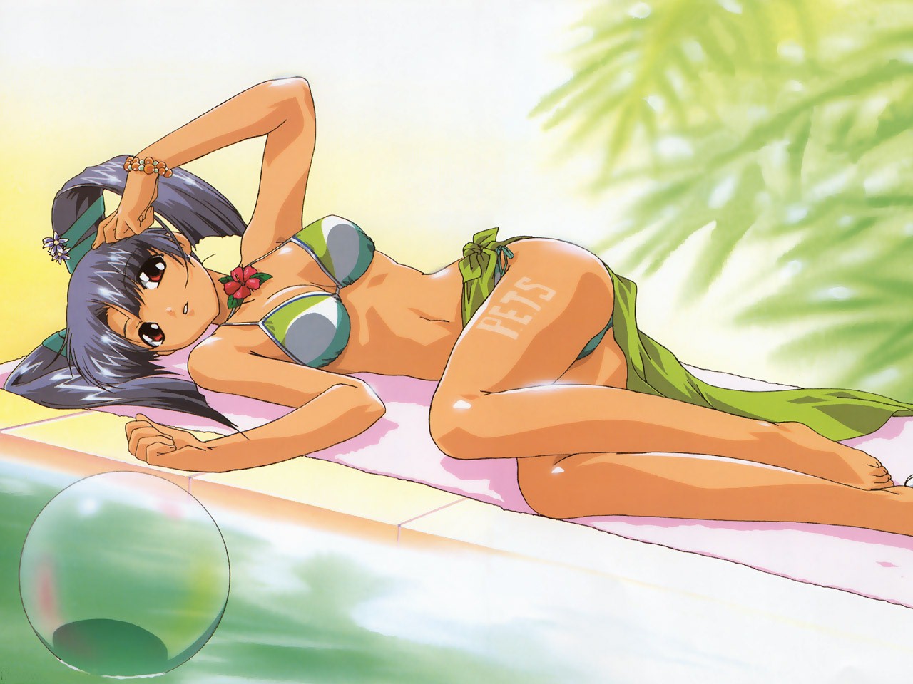 Description: A cartoon picture of a woman laying on a towel in the water with a ball in her hand and a palm tree in the background.