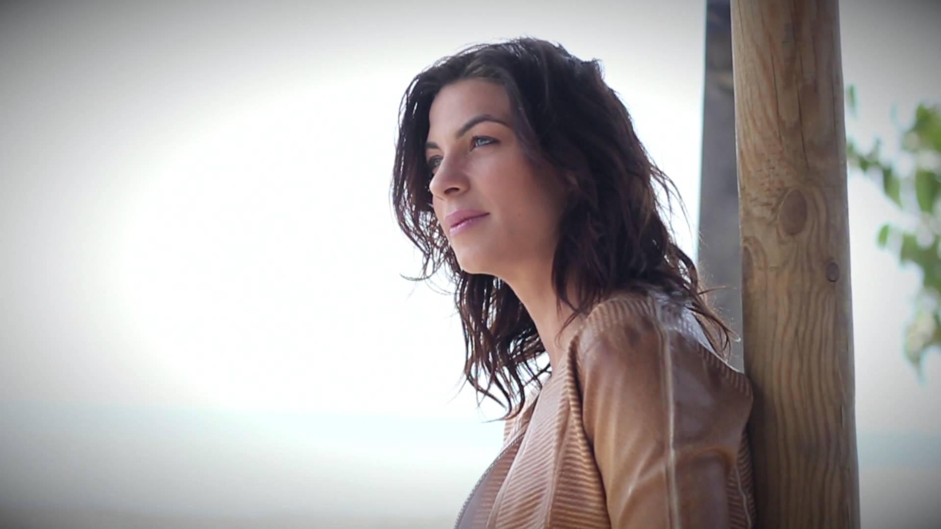 Description: A woman leaning against a wooden pole with her eyes closed and a tree in the background with a bright sun shining through the sky.
