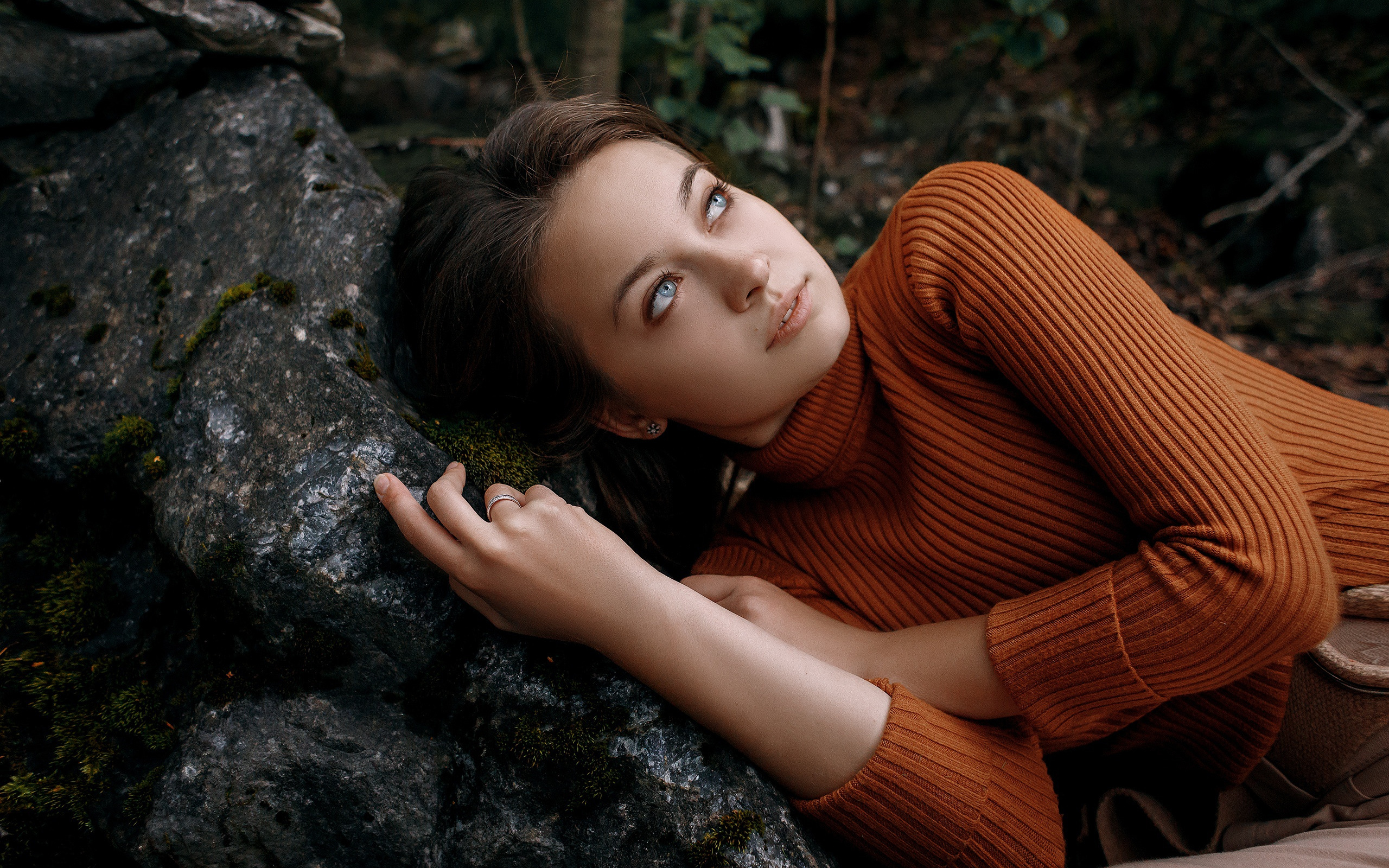 Description: A woman leaning on a rock in a forest with her eyes closed and her hand on her chest.