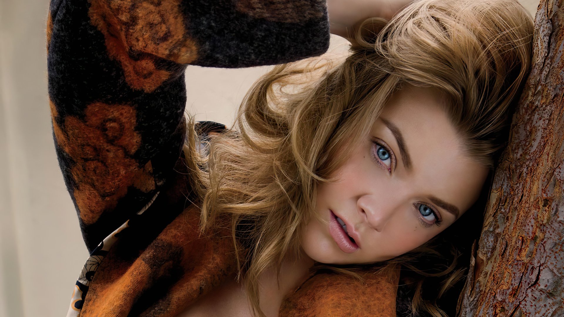 Description: A woman leaning against a tree with her hair blowing in the wind and a scarf around her neck and a sweater on her shoulders.