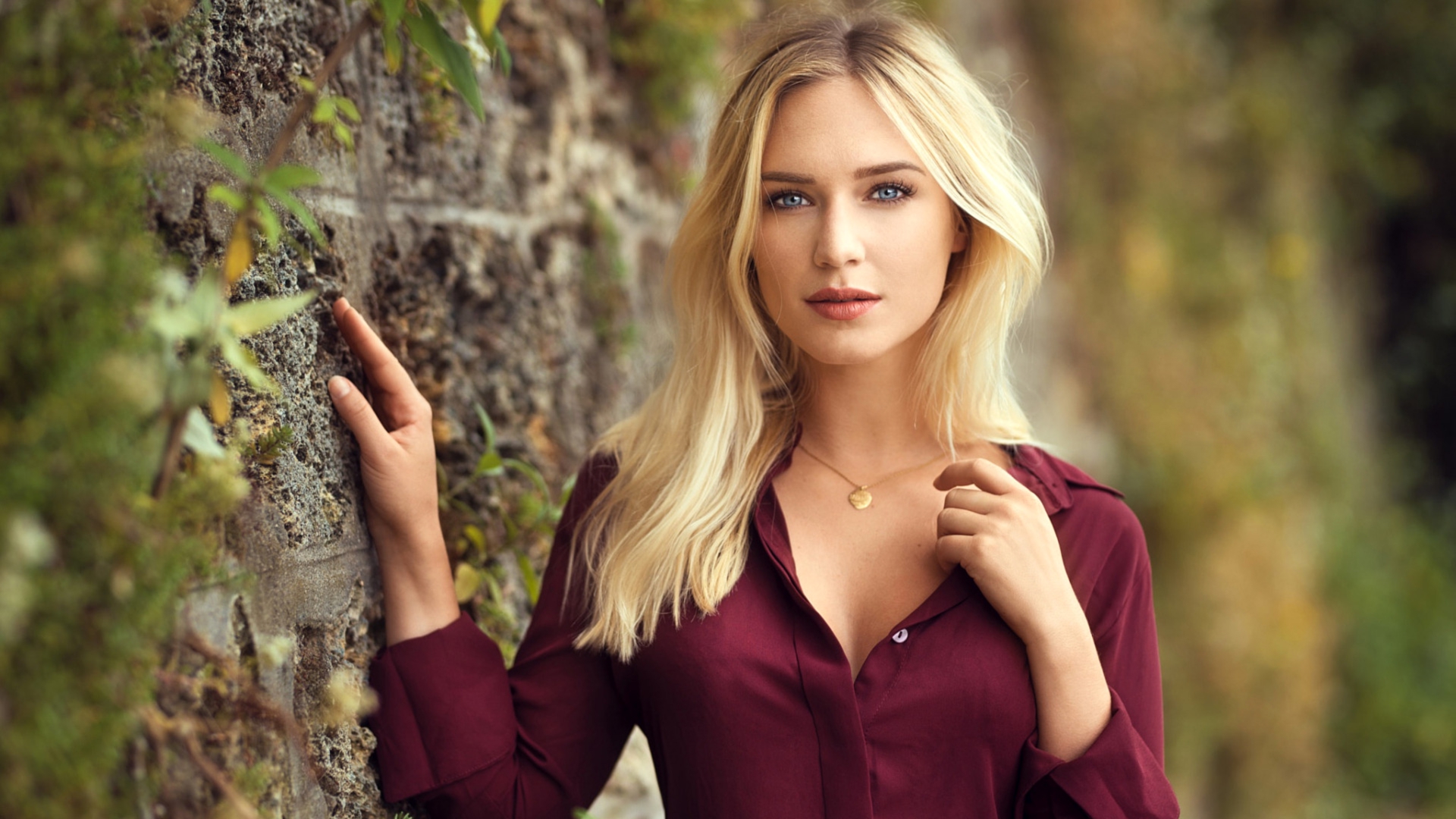 Description: A woman leaning against a tree wearing a red shirt and gold necklace and a necklace with a diamond on it.