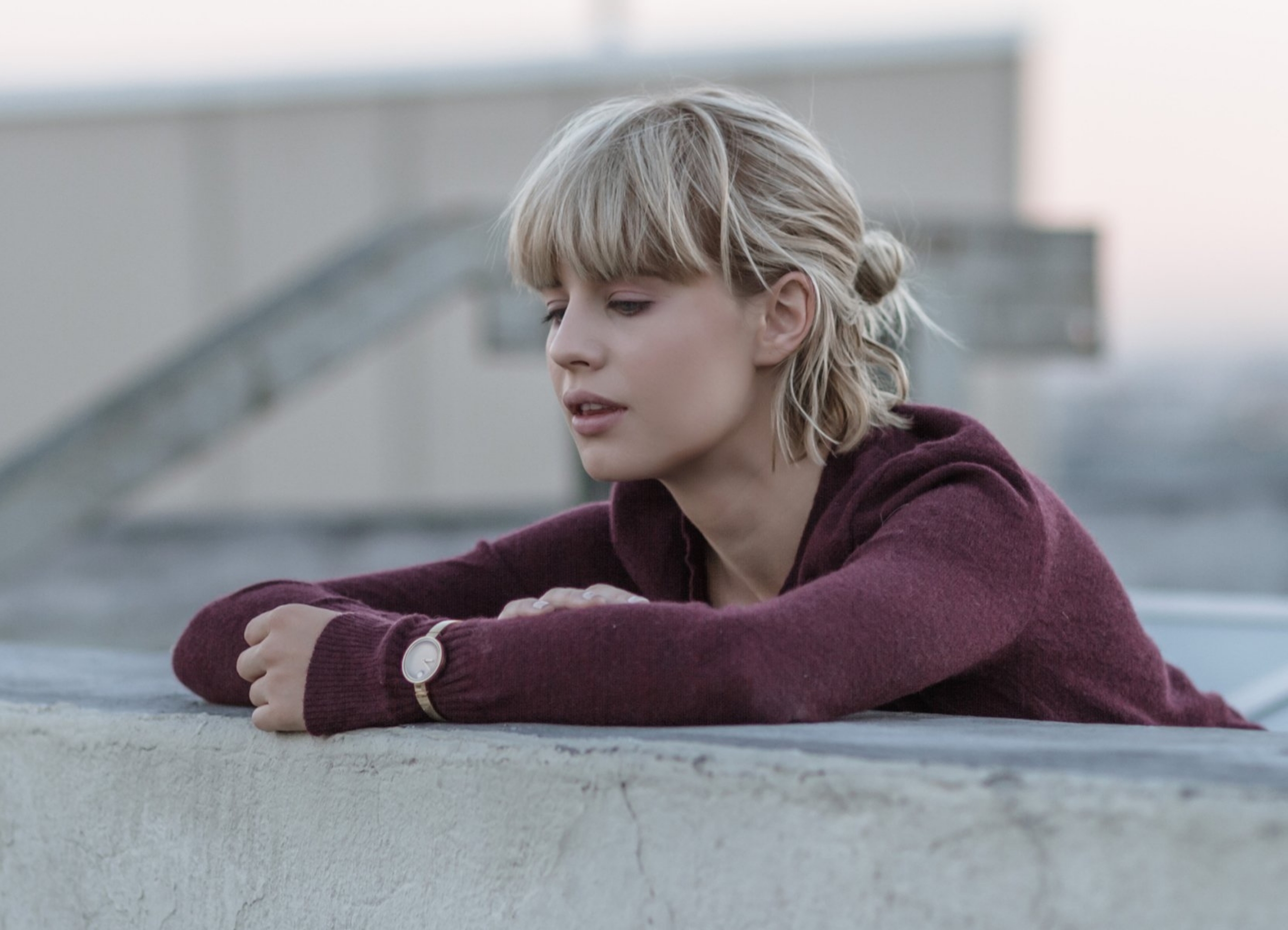 Description: A woman leaning on a wall with her arms crossed and looking off to the side with a building in the background.