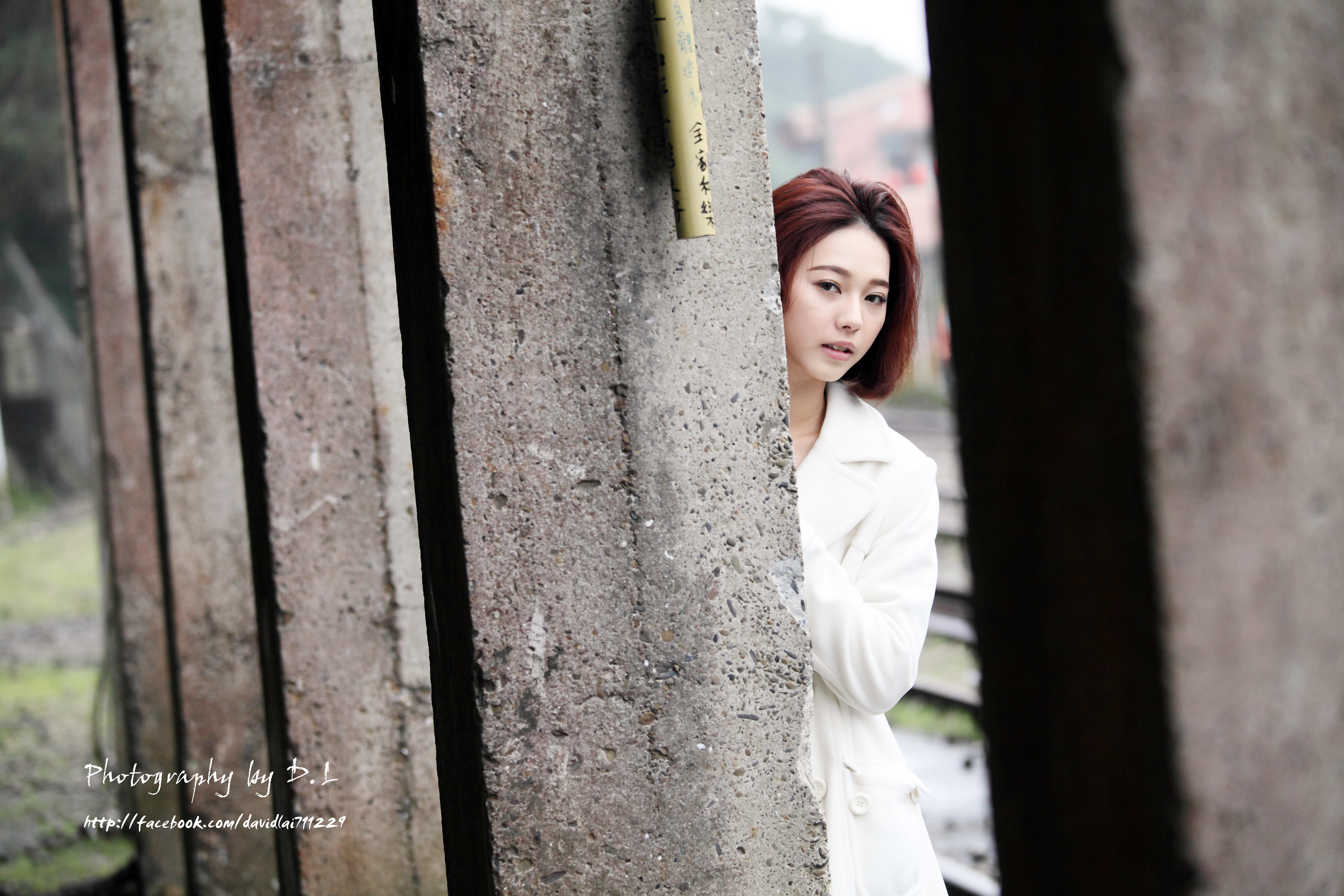 Description: A woman leaning against a wall with her hand on her head and looking at the camera with a serious look on her face.