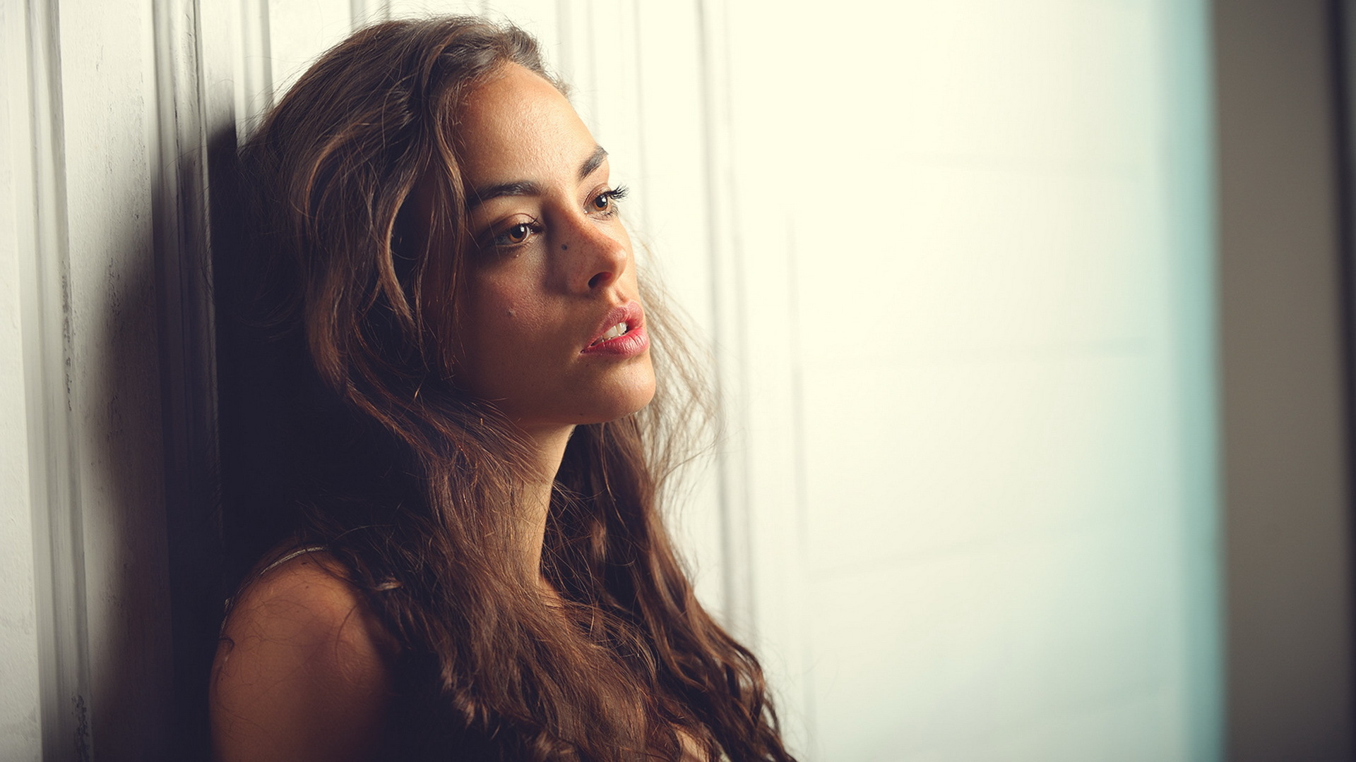 Description: A woman with long hair leaning against a wall looking off to the side with a serious look on her face.