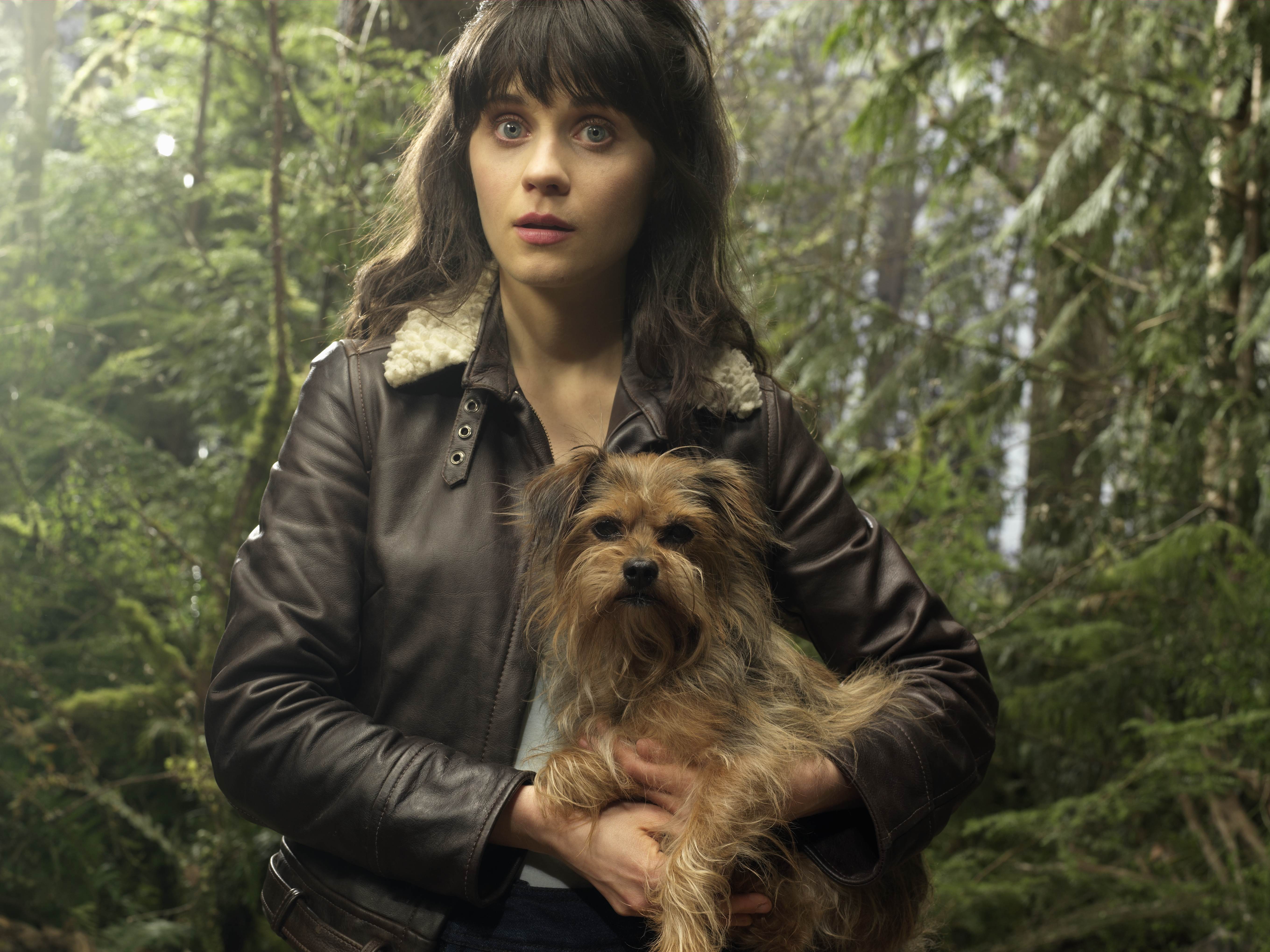 Description: A woman in a leather jacket holding a dog in a forest with trees in the background and sunlight streaming through the trees.