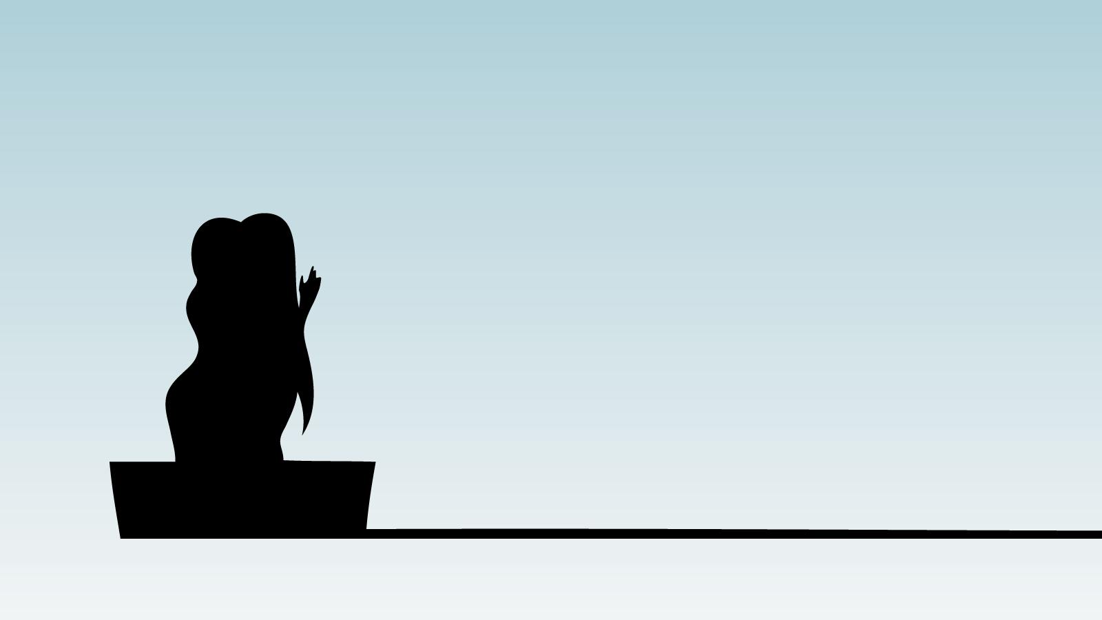 Description: A woman standing on a ledge with her hands up in the air and a sky background with a blue sky.