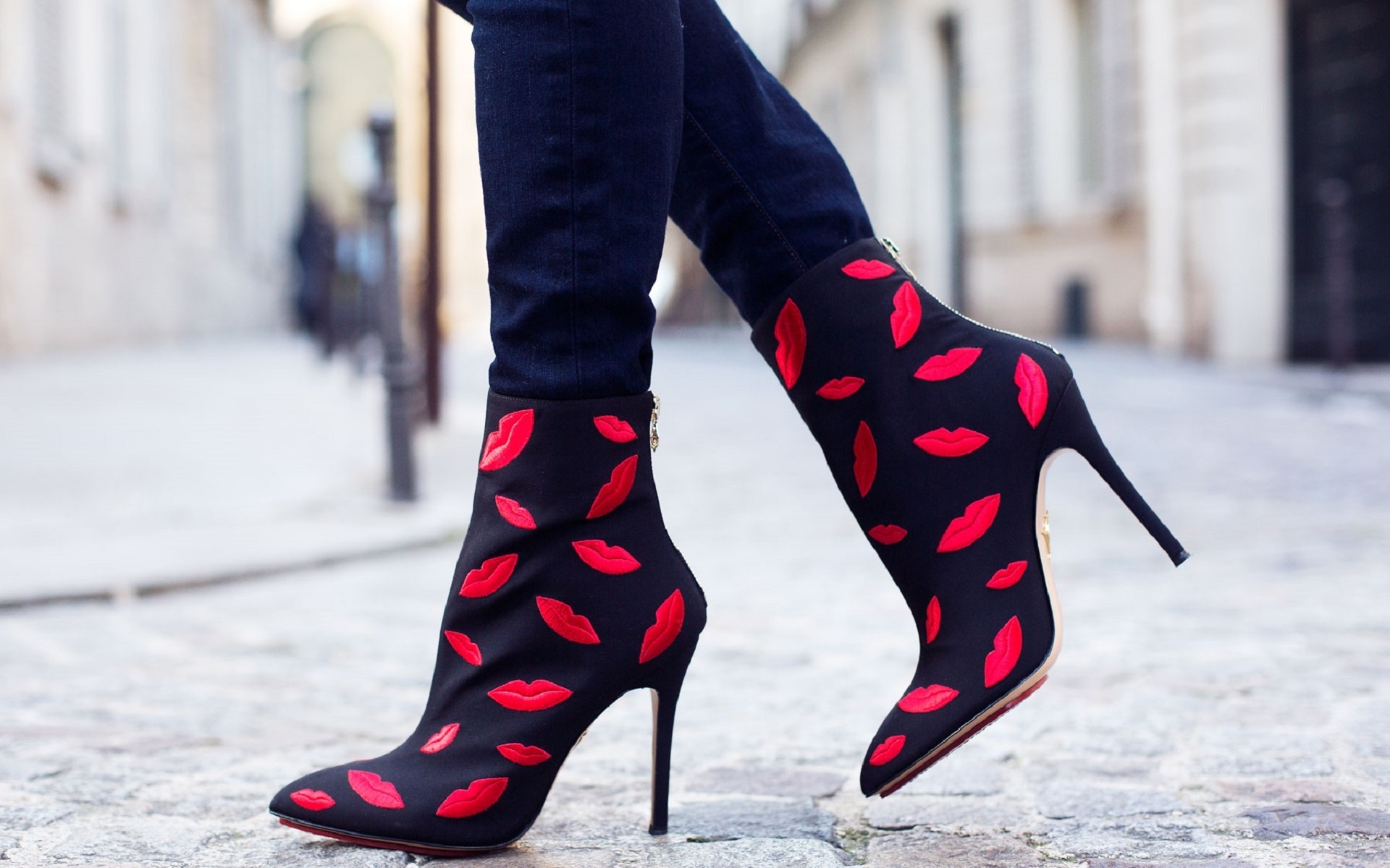 Description: A woman's legs wearing high heeled shoes with red lips on them and a black background with a white building.