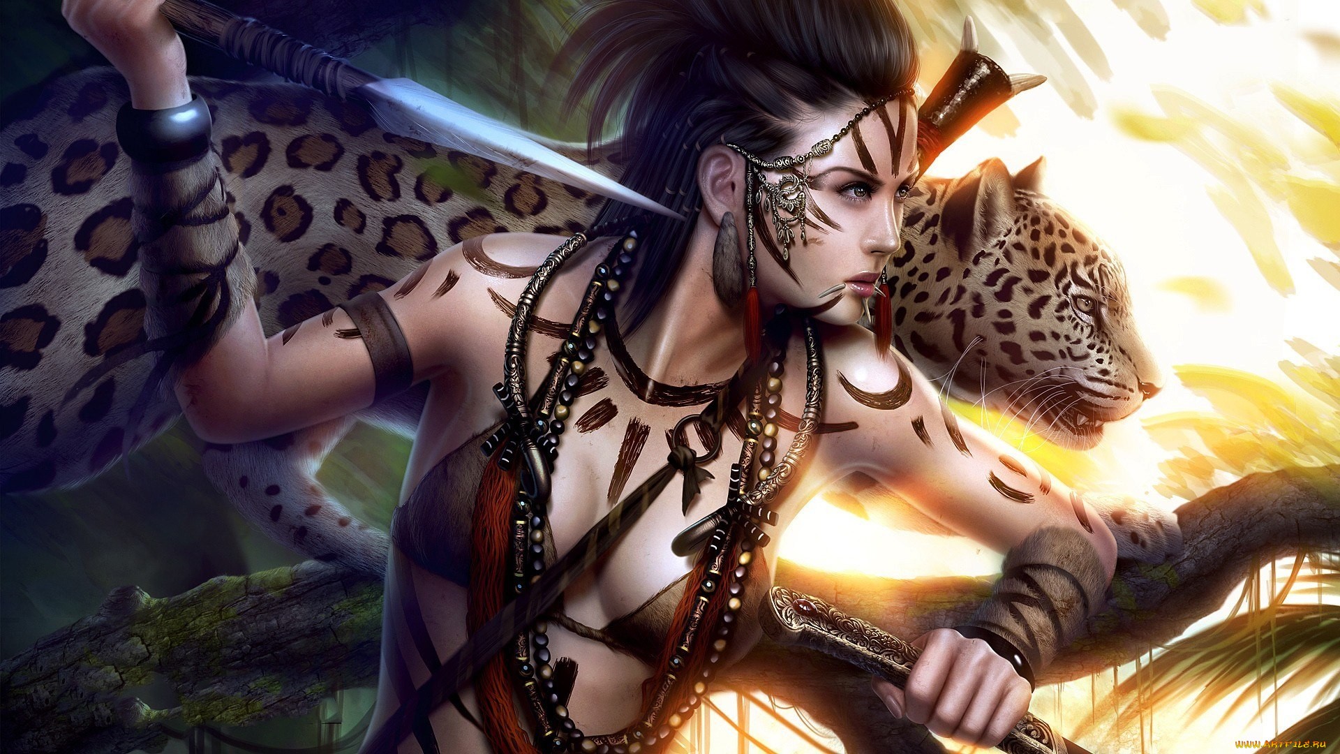 Description: A woman with a leopard on her shoulder holding a sword and a leopard on her shoulder.