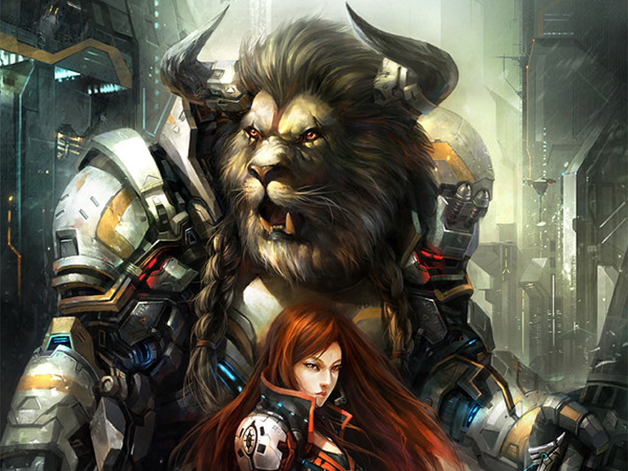 Description: A woman and a lion are standing in a city with a giant robot behind her.