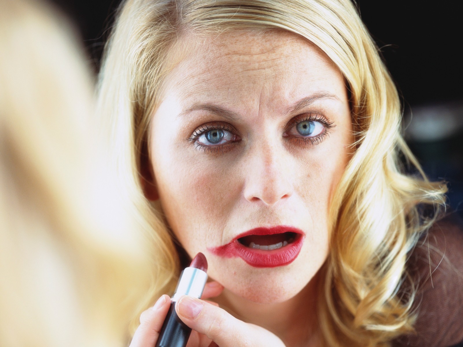 Description: A woman putting lipstick on her lips while looking at the mirror with a surprised look on her face and a red lip.