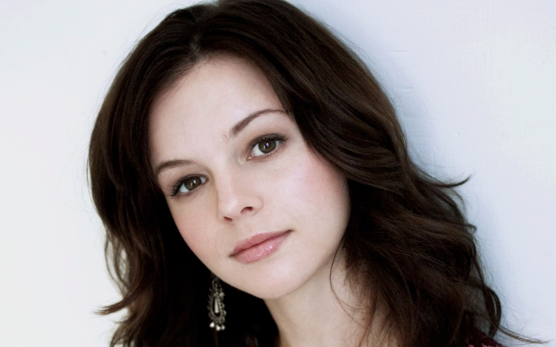 Description: A woman with long dark hair and a necklace on her neck posing for a picture with her hand on her shoulder.