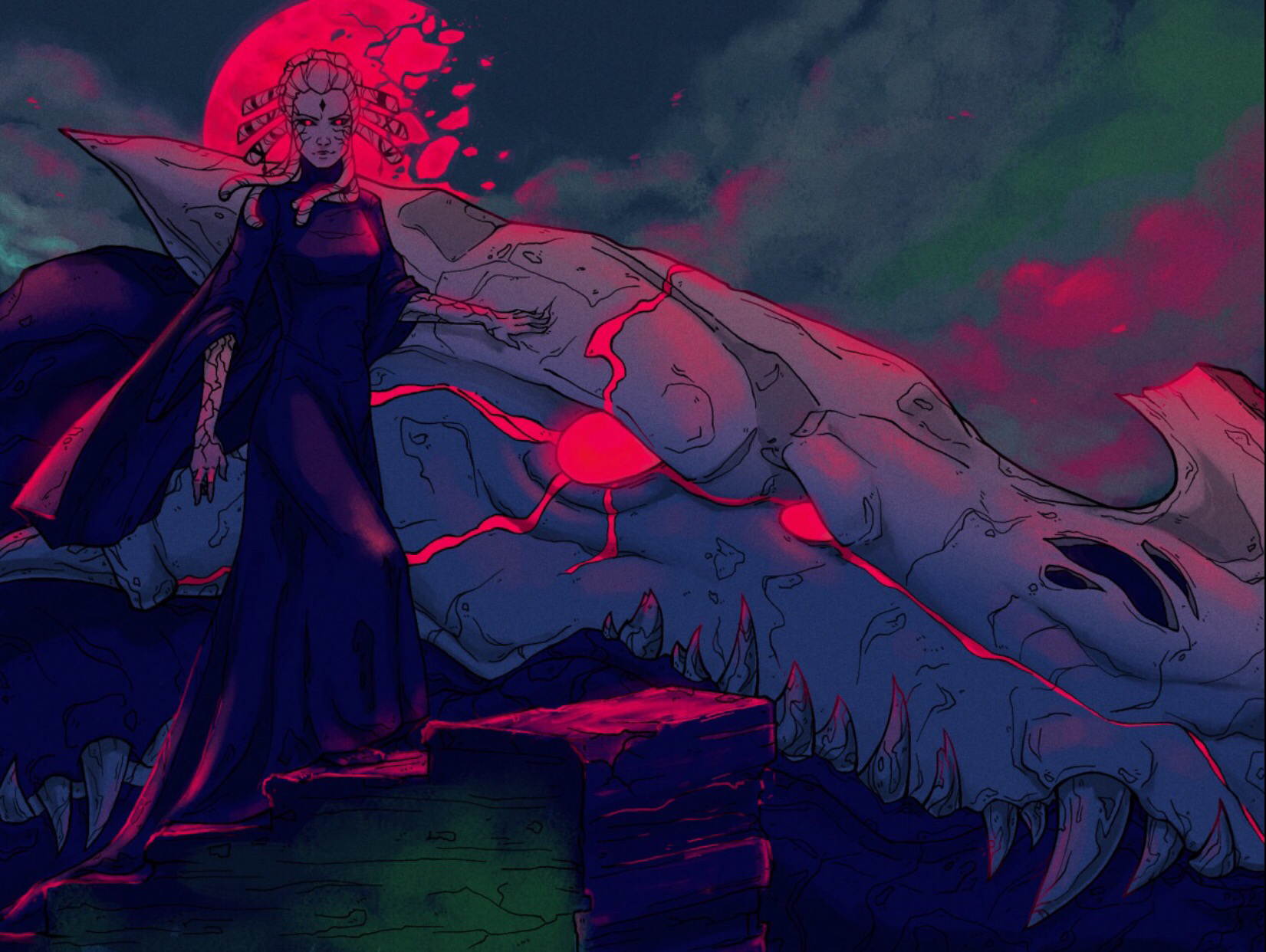 Description: A woman in a long dress standing on a rock with a red light behind her and a giant rock behind her.