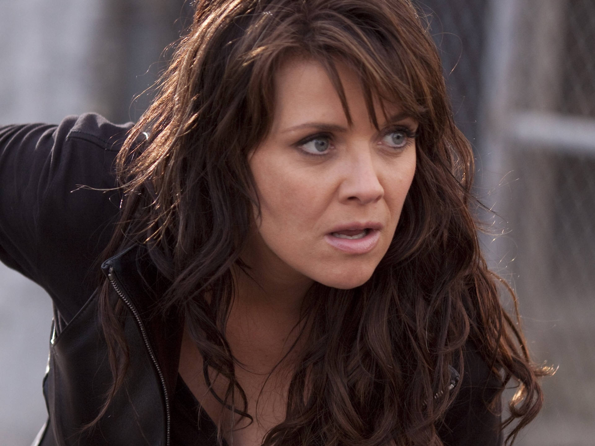 Description: A woman with long hair and a black jacket on looking at something with a surprised look on her face.