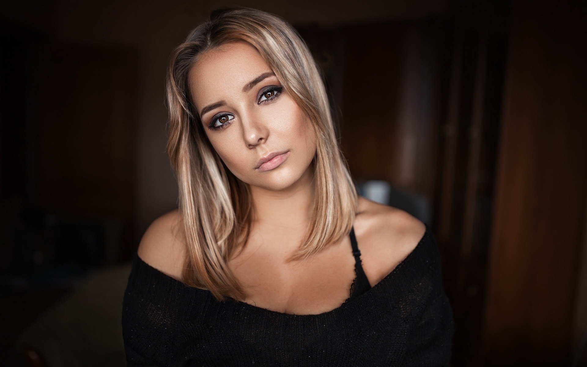 Description: A woman with long hair and a black top posing for a picture in a dark room with a wooden door.