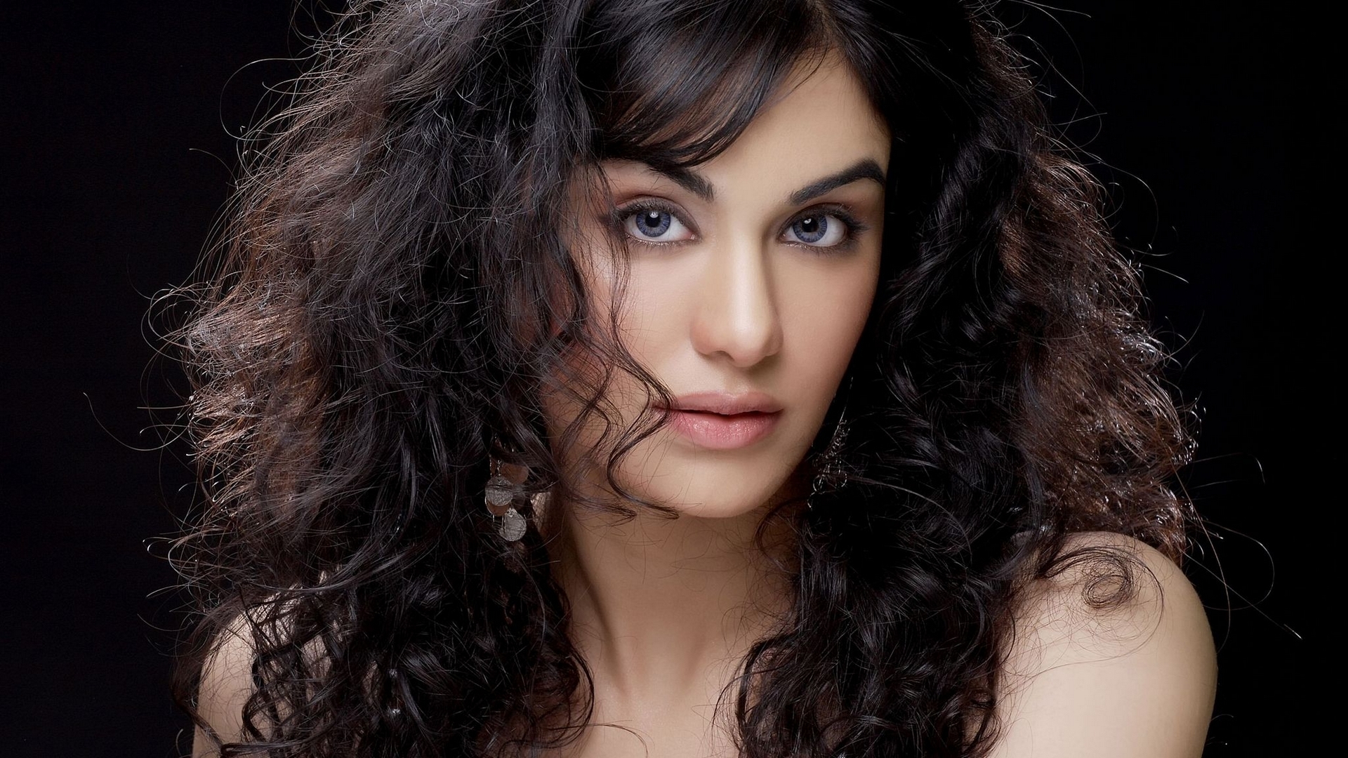 Description: A woman with long hair posing for a picture with a black background and a black background behind her is a black background.