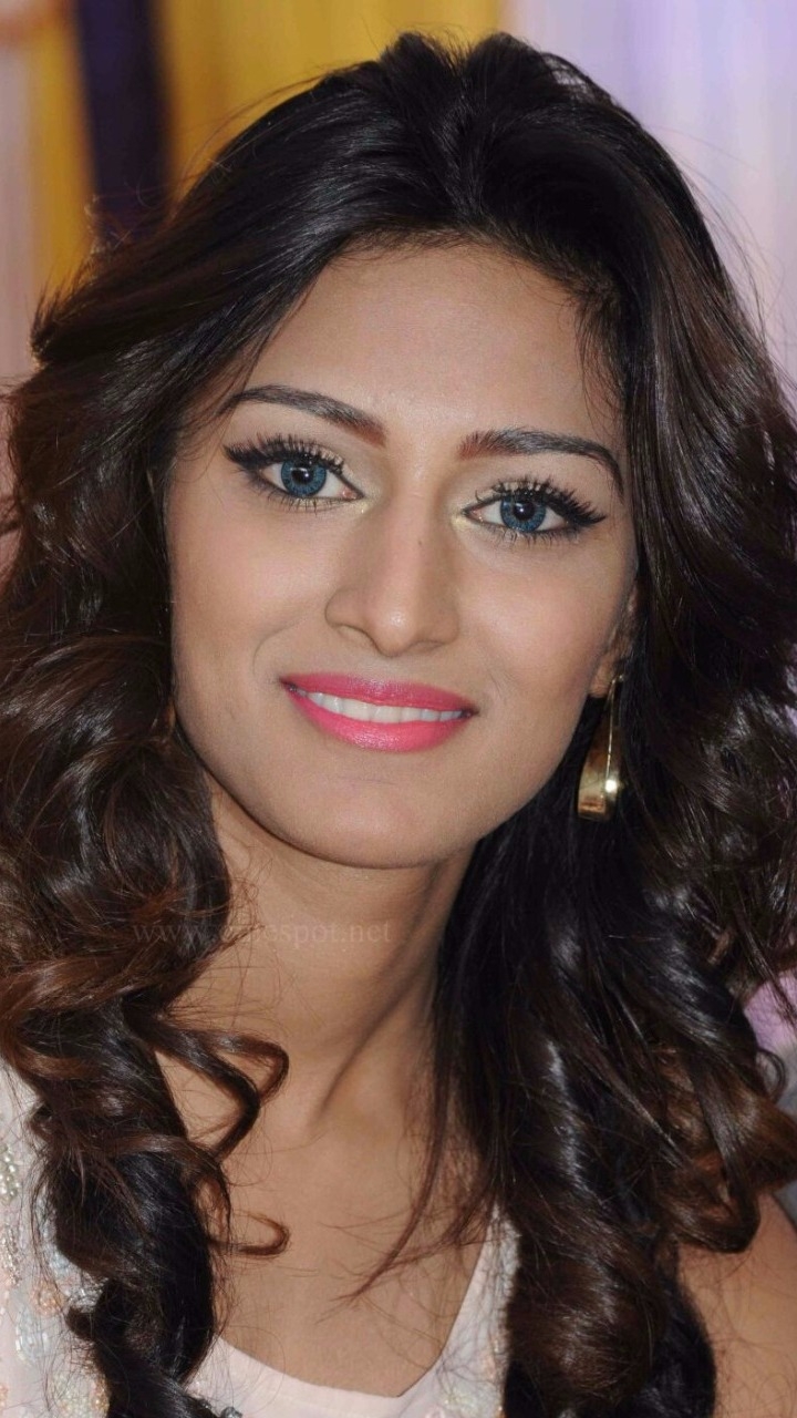 Description: A woman with long hair and blue eyes smiling at the camera with a smile on her face and a pink dress.