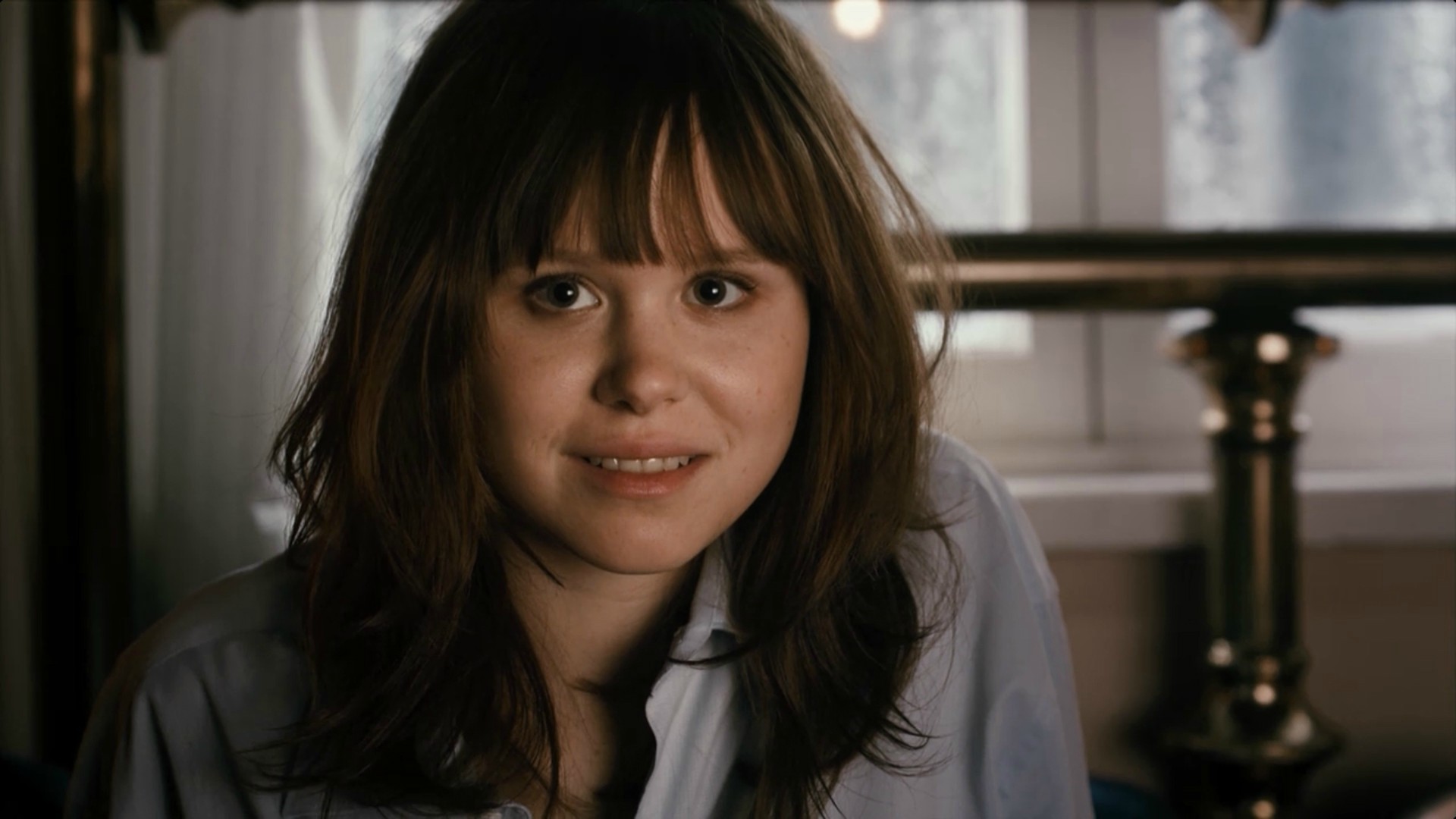 Description: A woman with long hair and a blue shirt is looking at the camera and smiling at the camera with a serious look on her face.