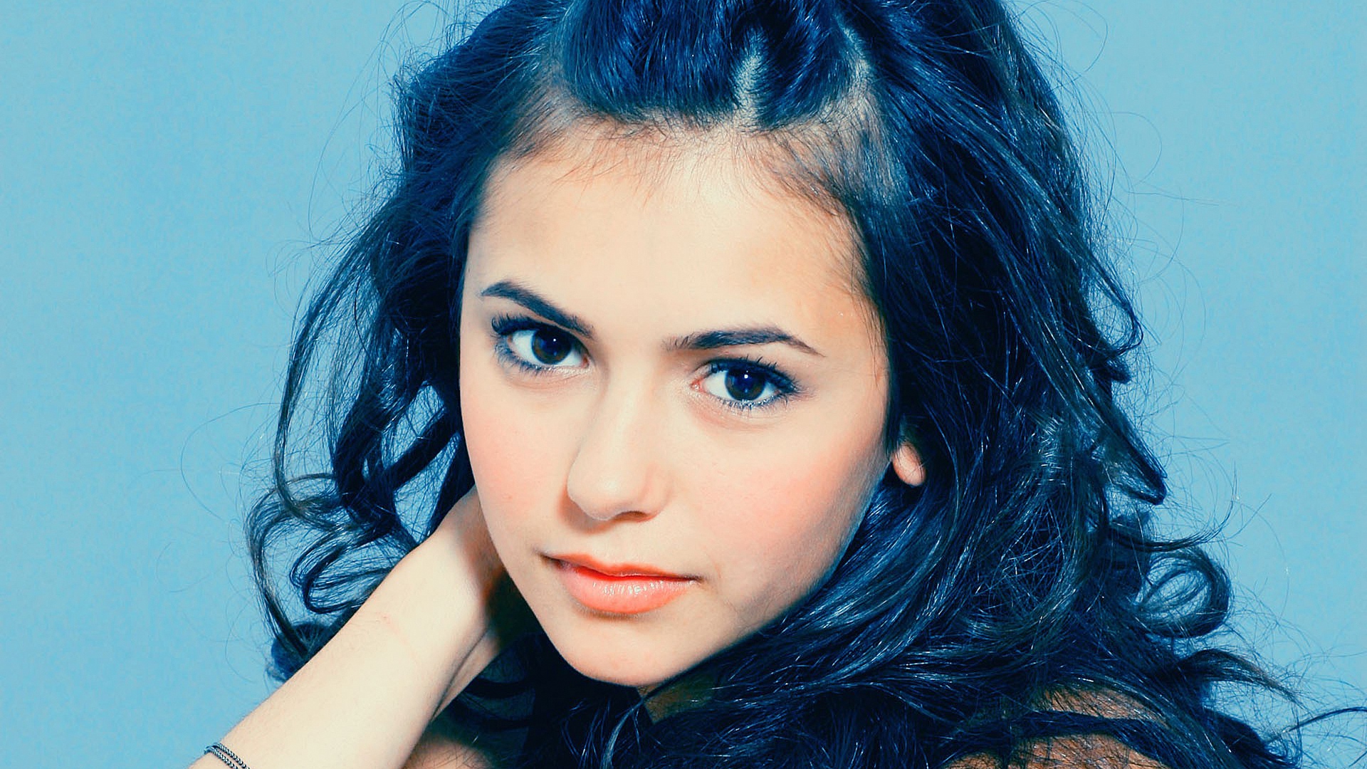 Description: A woman with long hair and a bracelet on her wrist posing for a picture with her hand on her chin.