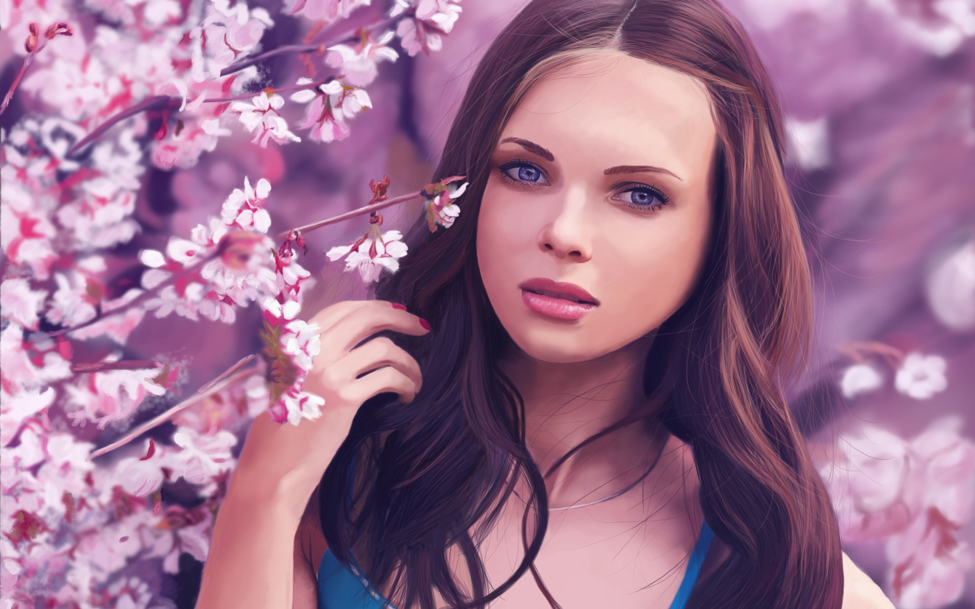 Description: A woman with long hair standing in front of a tree with pink flowers on it and looking at the camera.