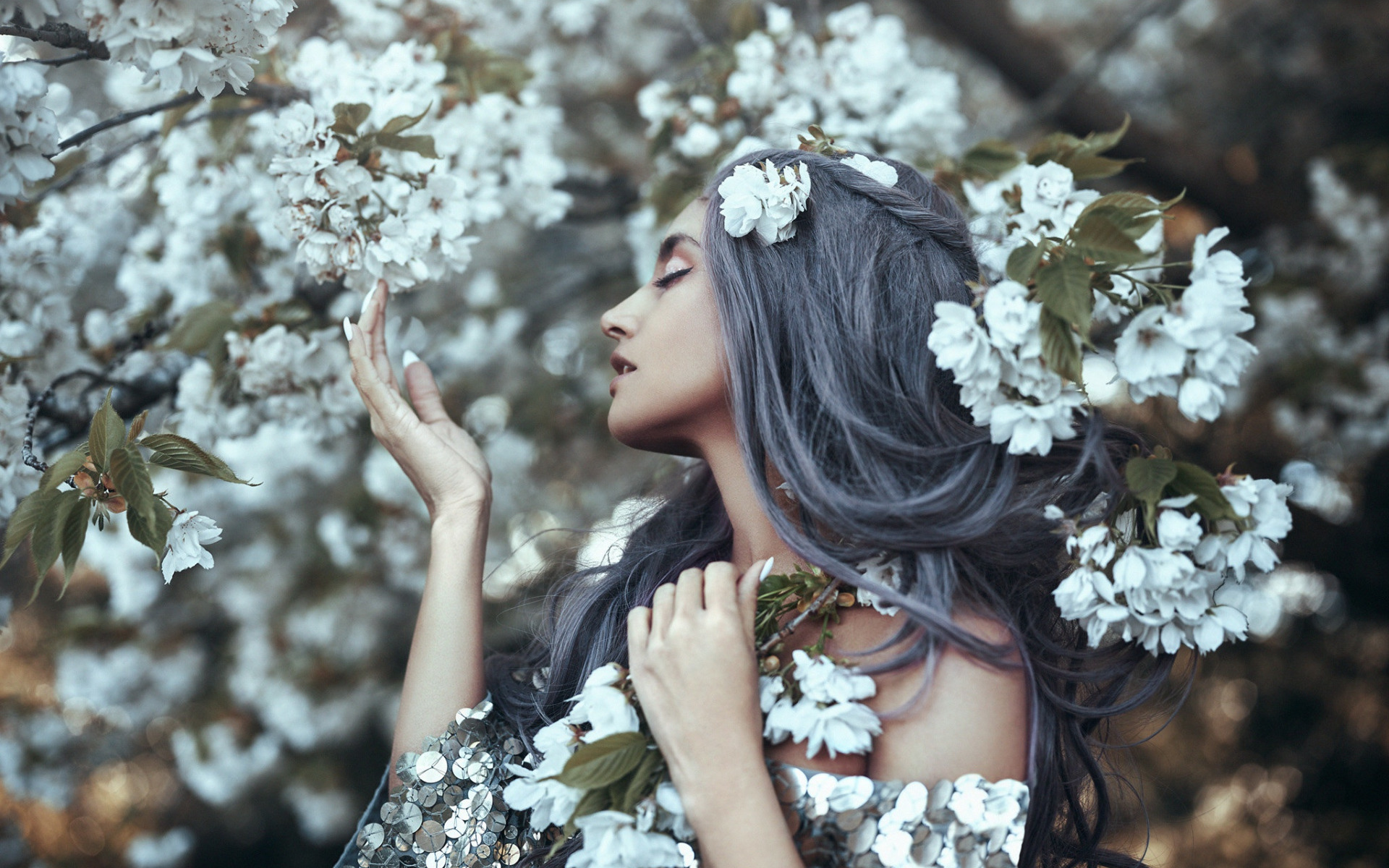 Description: A woman with long hair and a flower in her hair standing in front of a tree with white flowers.