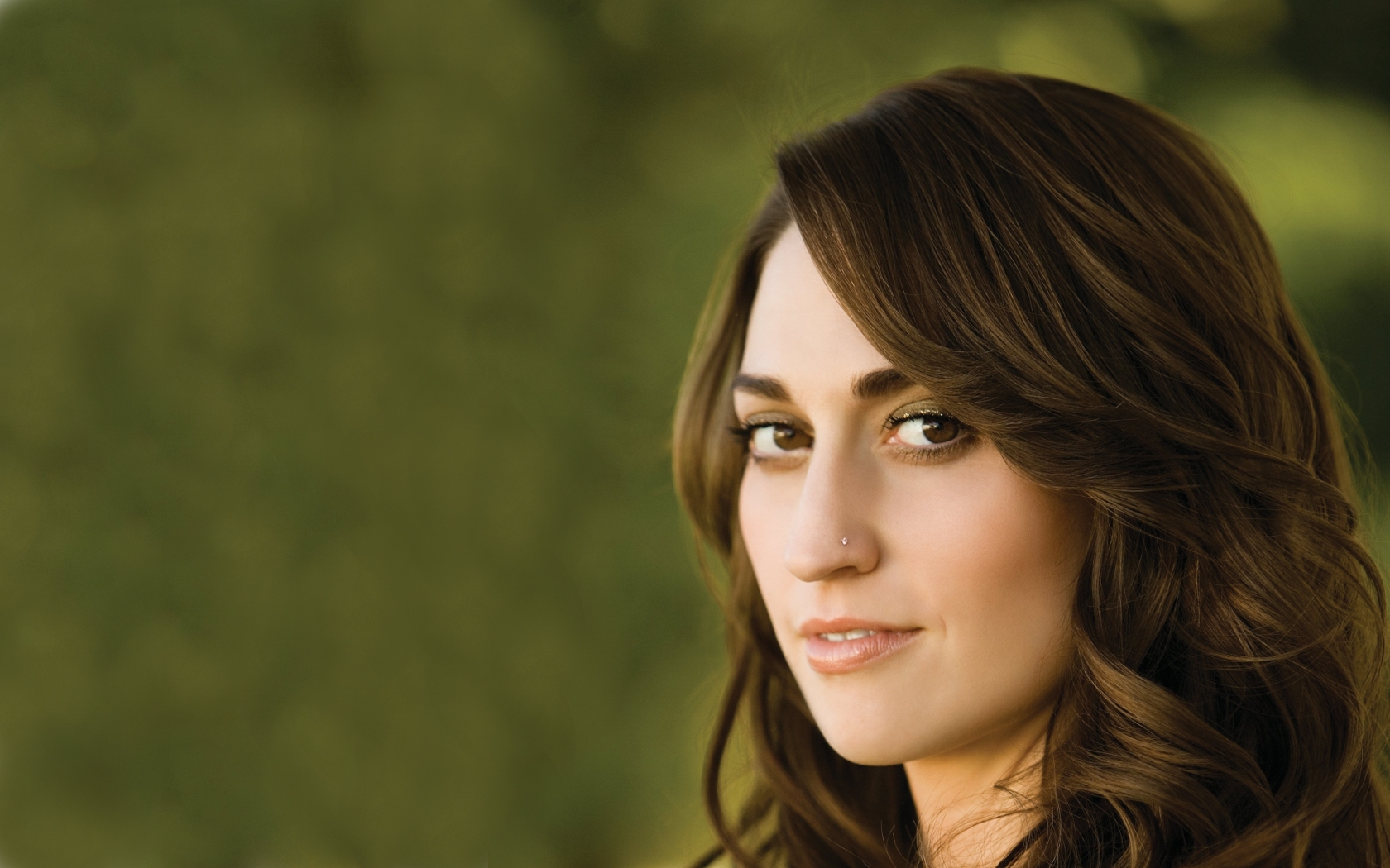 Description: A woman with long hair and a green background is looking at the camera with a serious look on her face.