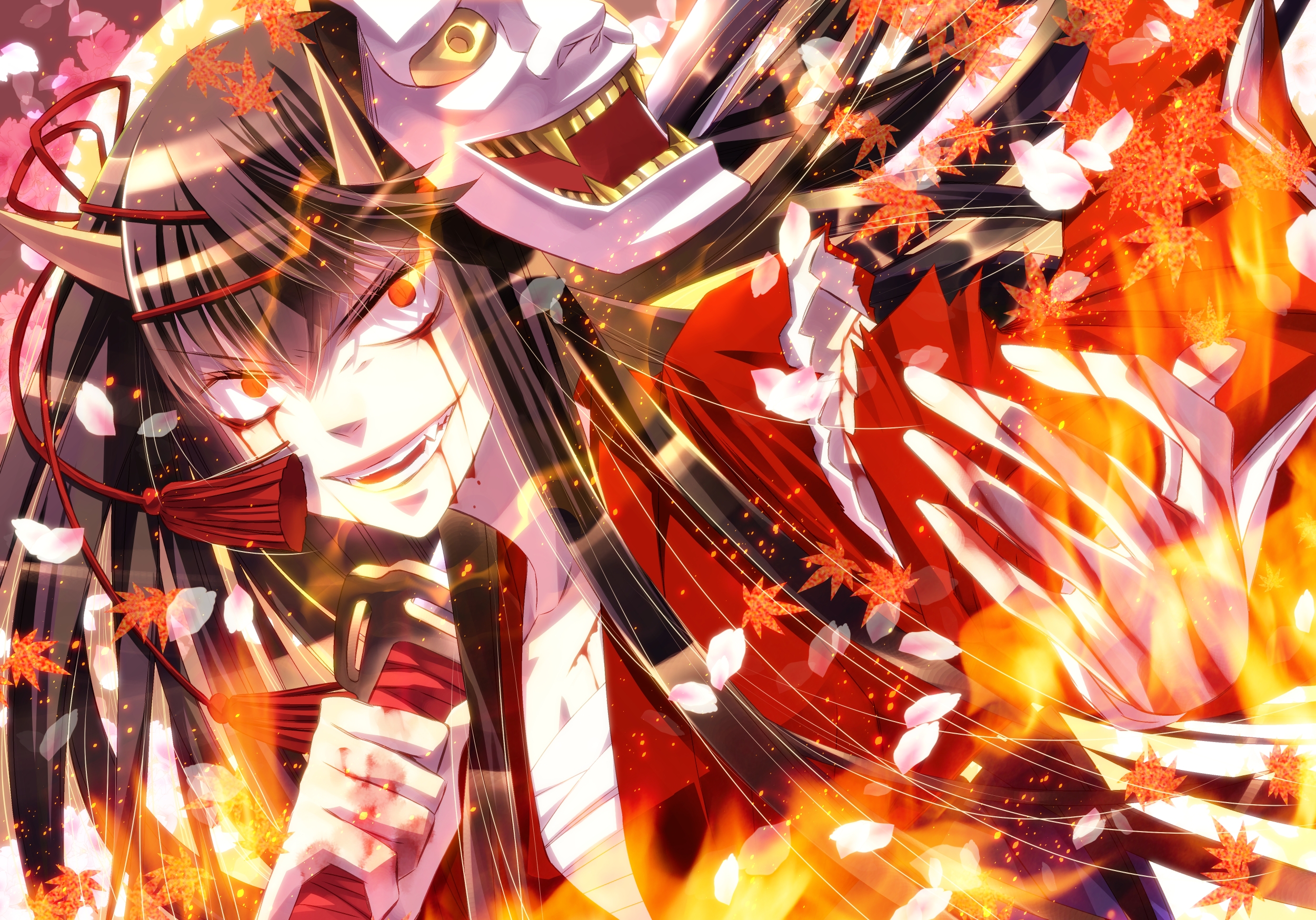 Description: A woman with long hair and a hat on holding a knife in her hand and a fire in the background.
