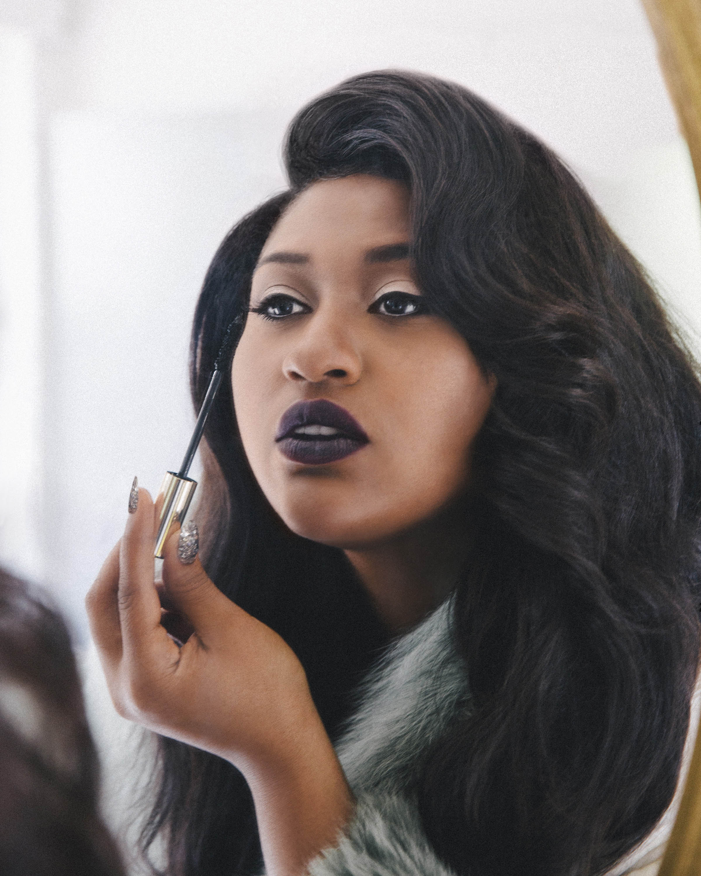 Description: A woman with long hair and a lipstick brush in her hand and a mirror behind her.