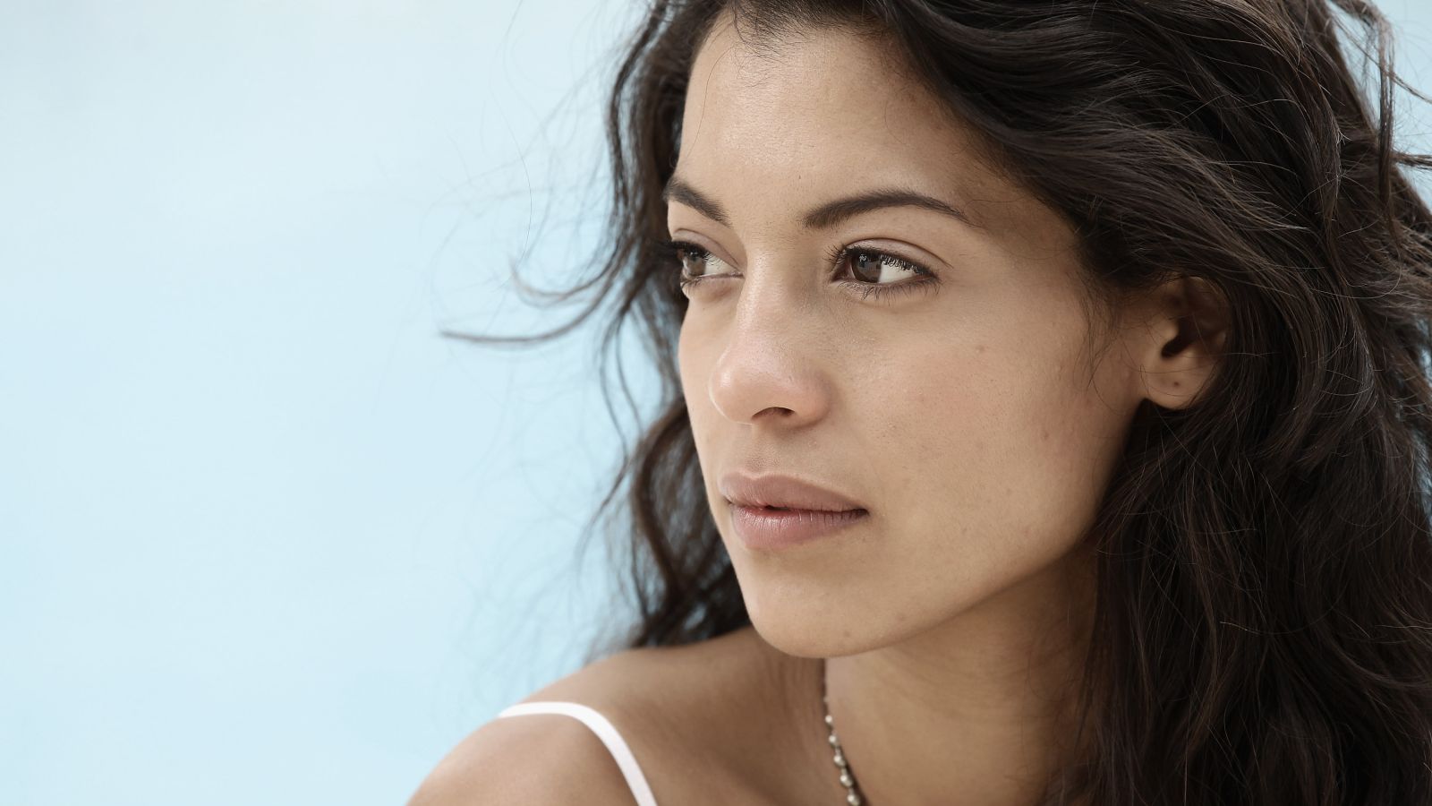 Description: A woman with long hair and a necklace on her neck looking off to the side with a blue background.