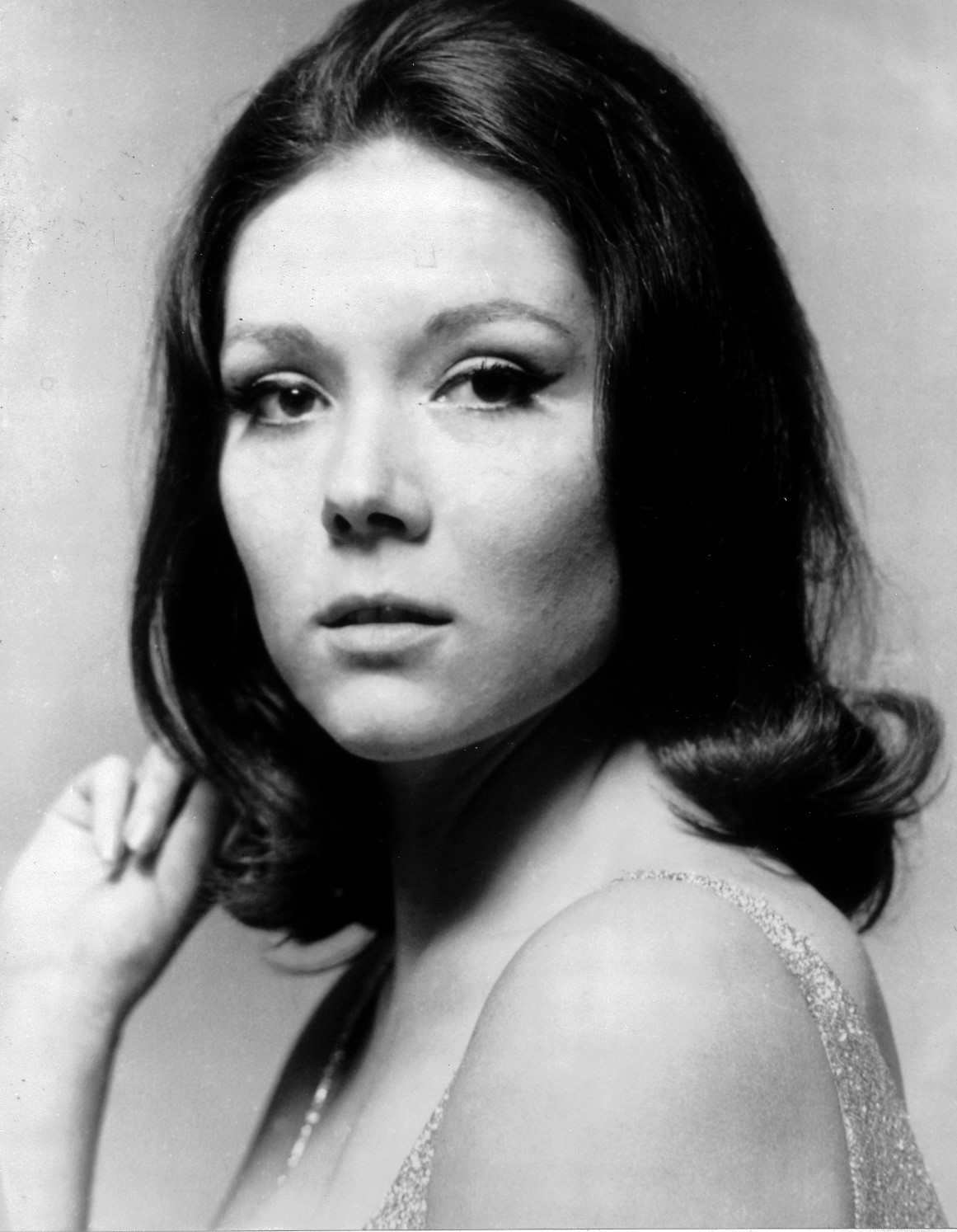 Description: A woman with long hair posing for a picture in a black and white photo with her hand on her chin.