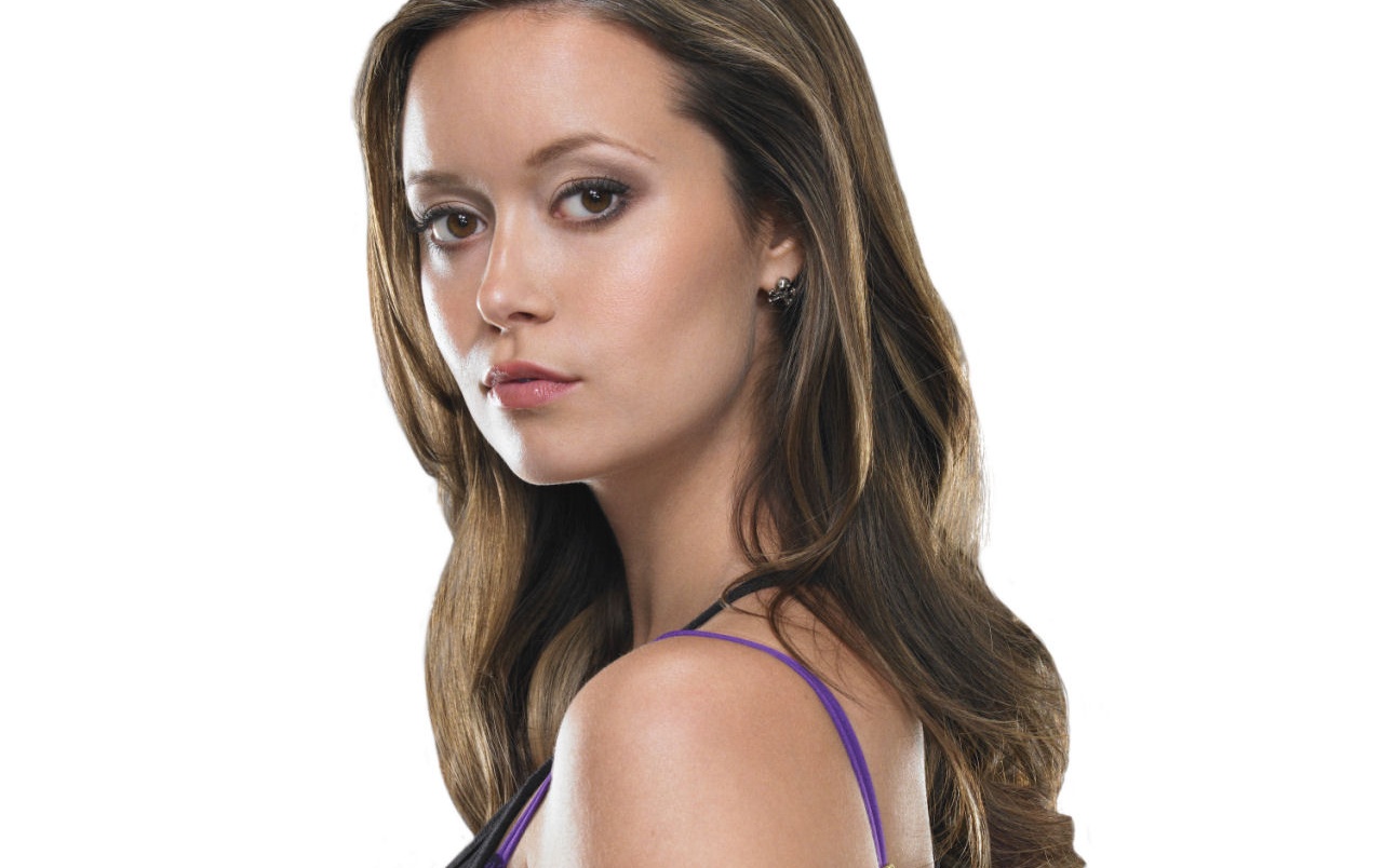 Description: A woman with long hair and a purple top on a white background with a white background and a white background.