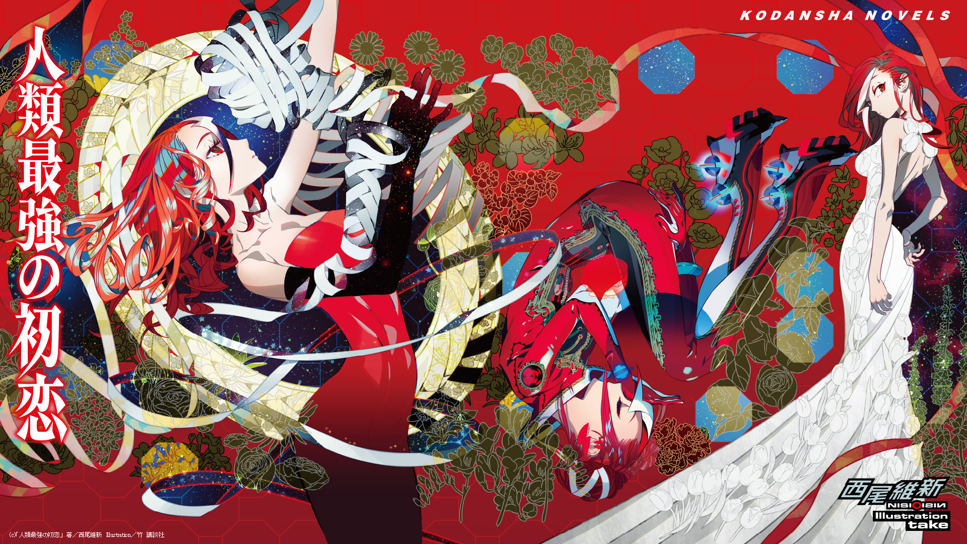 Description: A woman with long hair and a red background with a red background and a red background with a white and blue design.