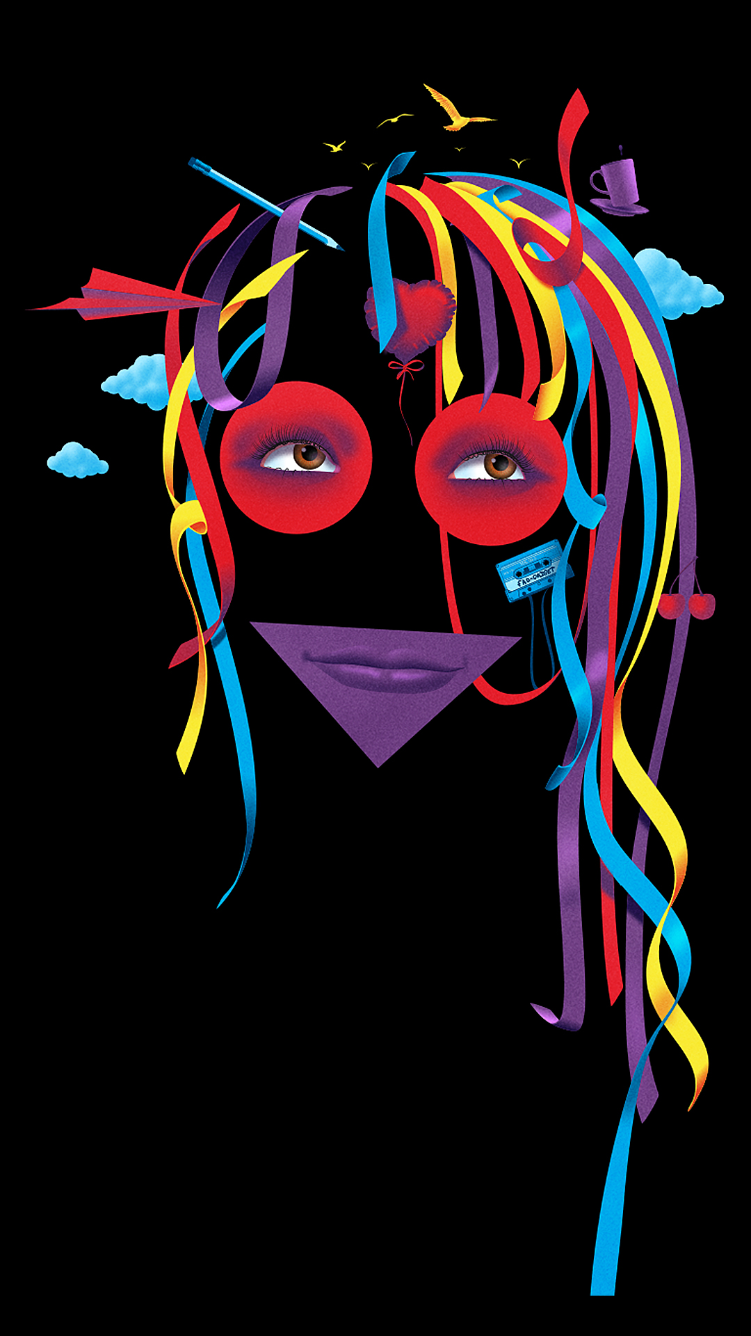 Description: A woman with long hair and red eyes with a blue sky in the background and a rainbow streamer in the foreground.