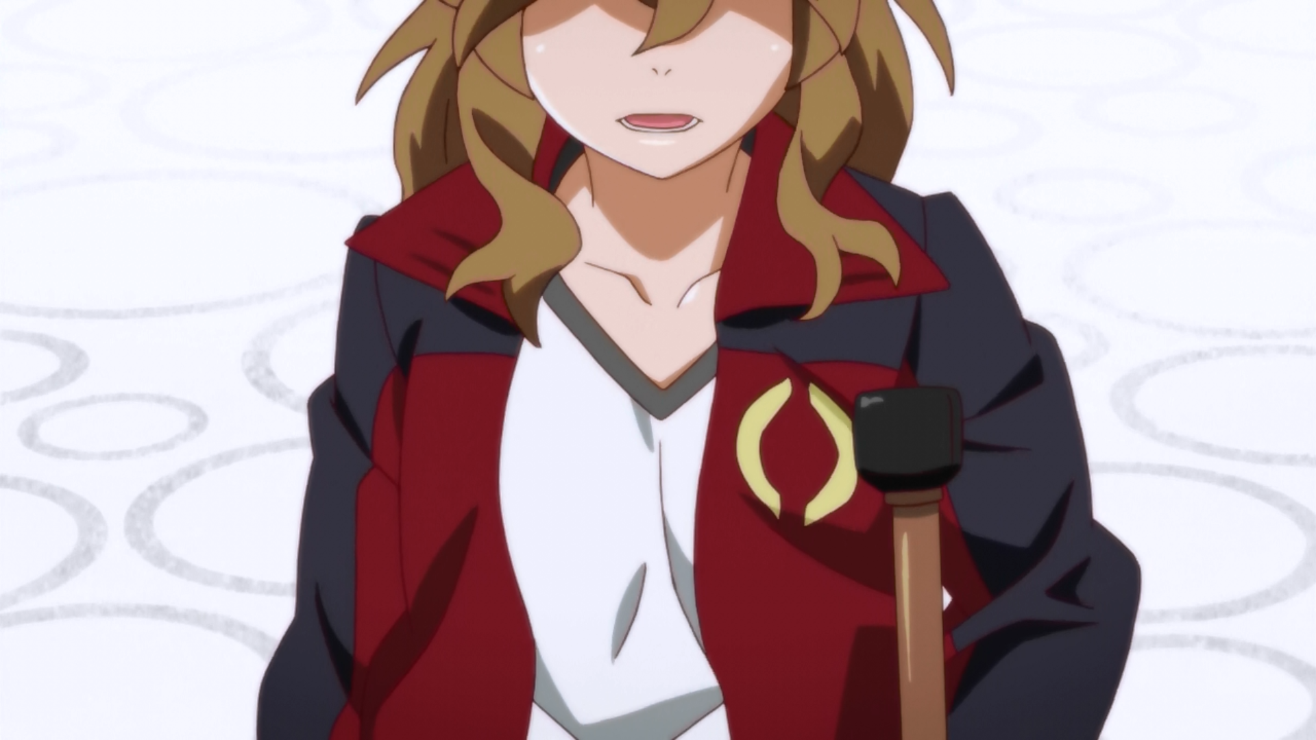 Description: A woman with long hair and a red jacket is standing in front of a white wall with circles on it.