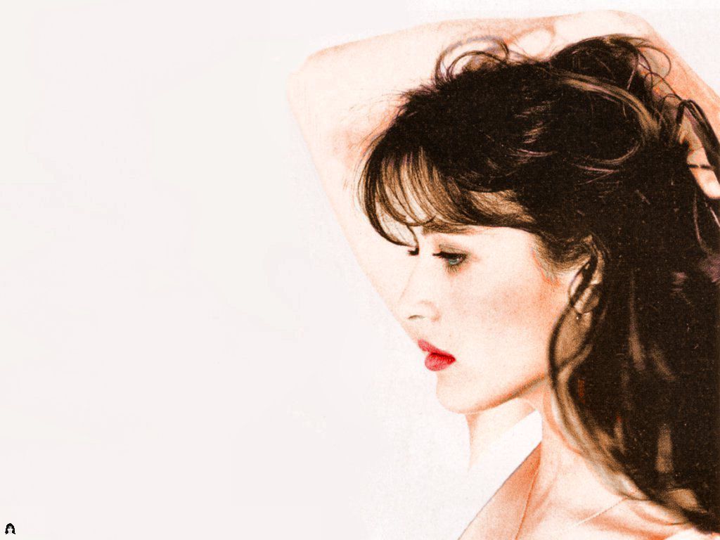 Description: A woman with long hair and a red lipstick is posing for a picture with her hair blowing in the wind.