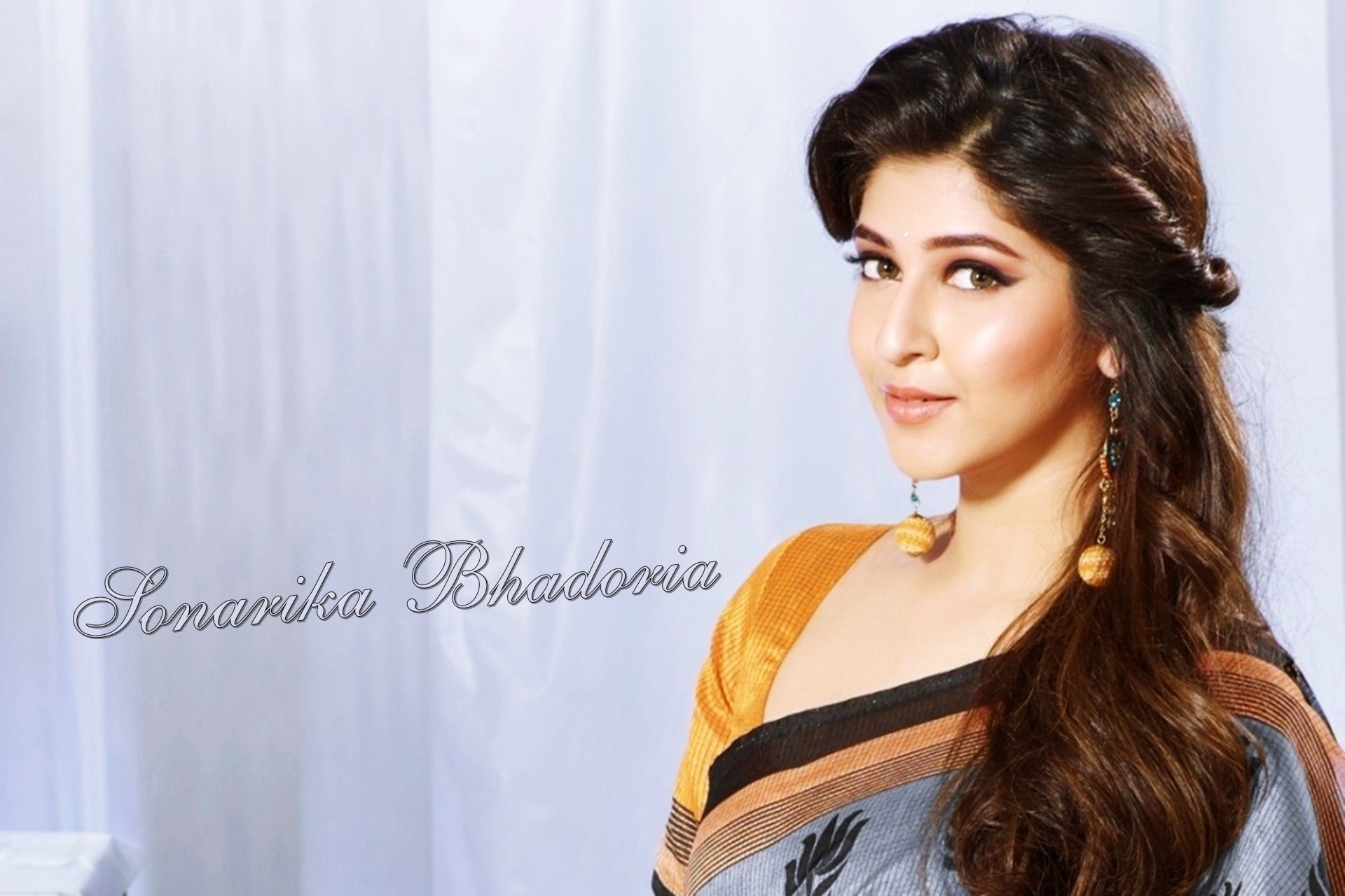 Description: A woman with long hair wearing a sari and earrings on her head.