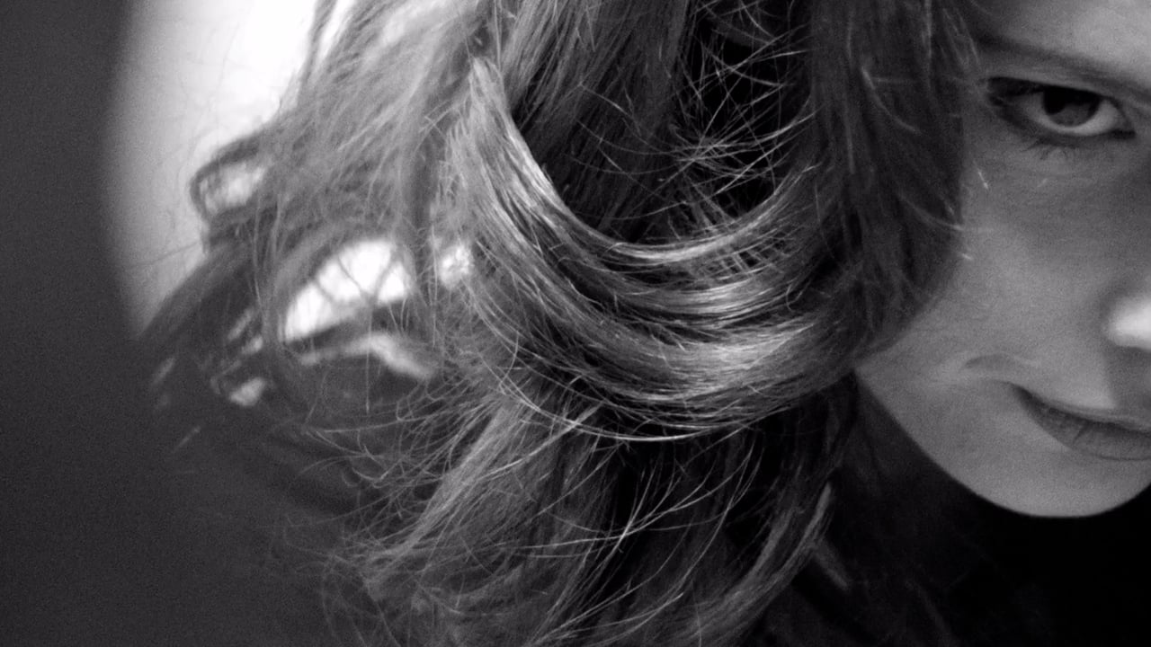 Description: A woman with long hair looking at the camera with a serious look on her face and shoulder.