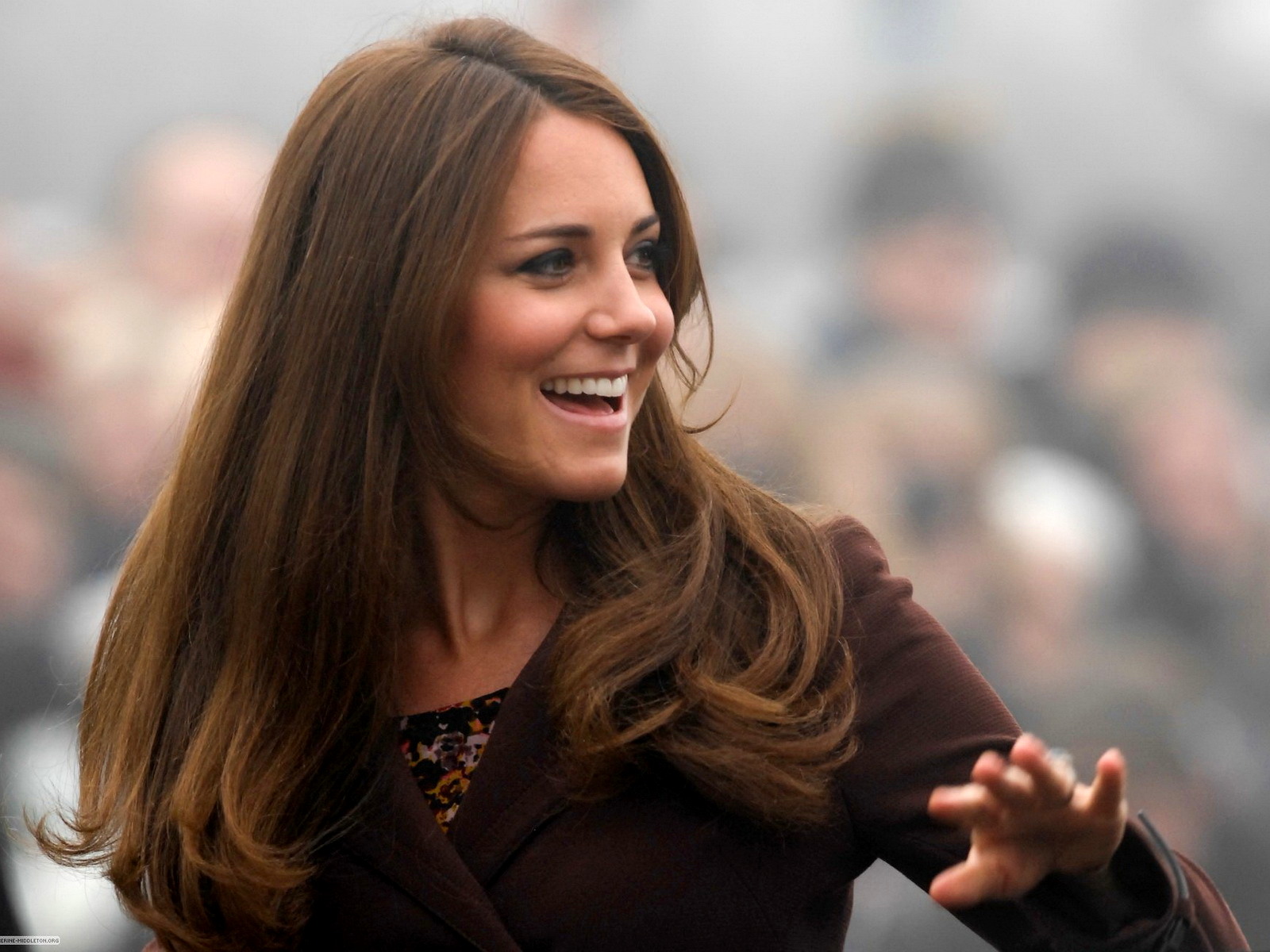 Description: A woman with long hair is smiling and talking to a crowd of people behind her on a rainy day.